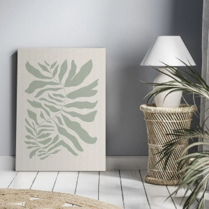 • Dieser Leinwanddruck zeigt ein dezentes smaragdgrünes Zweig- und Blattmotiv vor hellem Hintergrund. Er ist die perfekte Dekoration für ein modernes, minimalistisches Interieur.