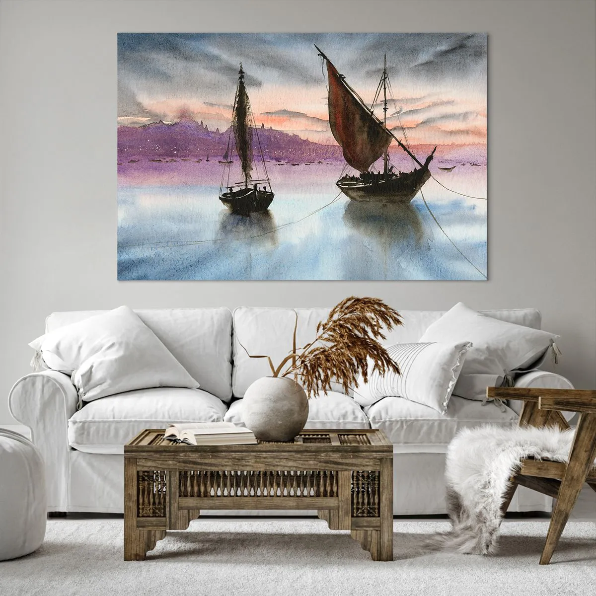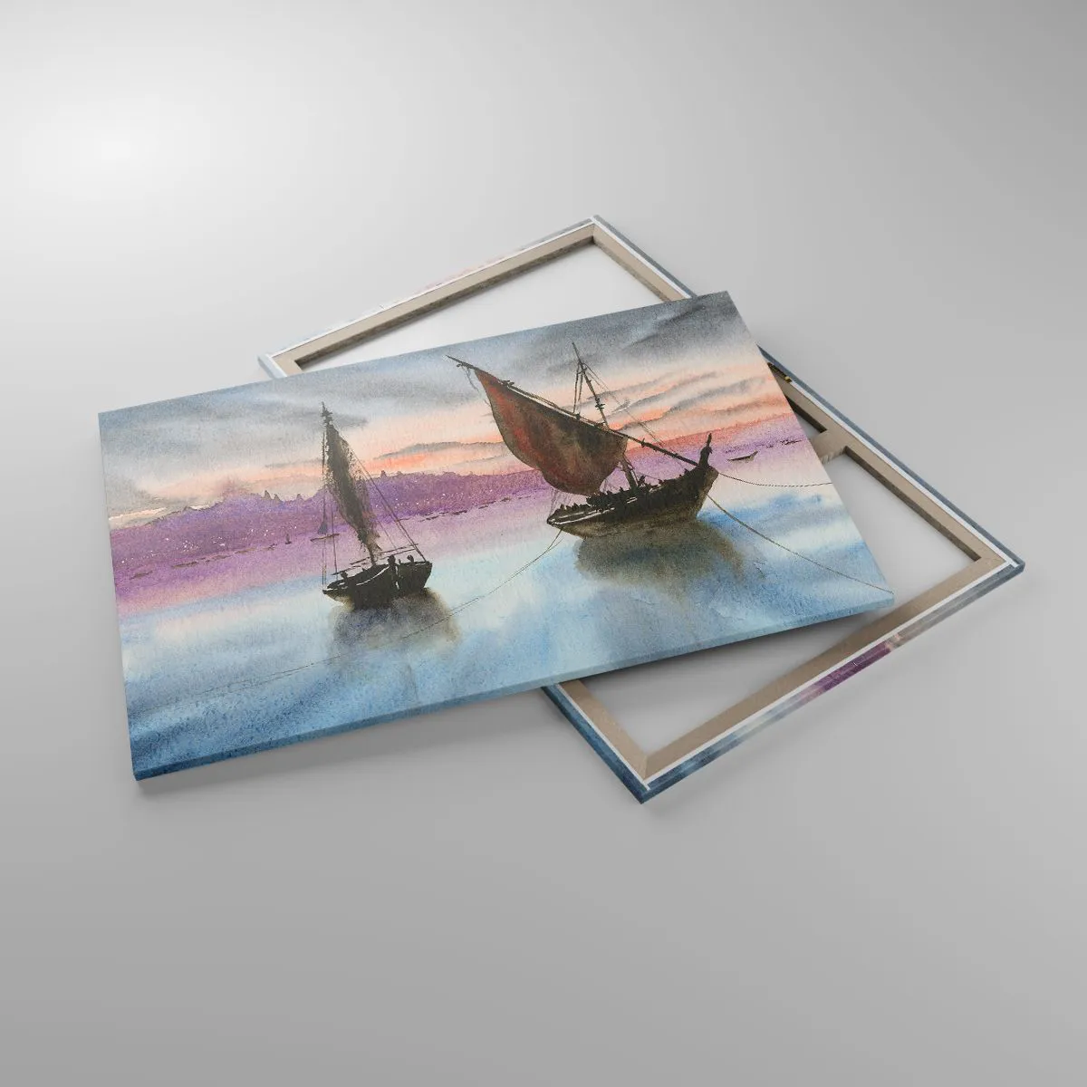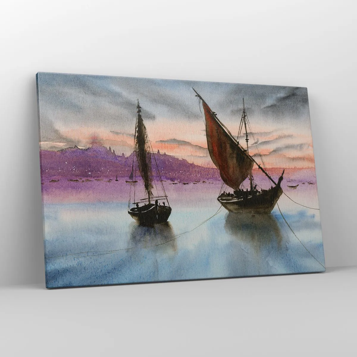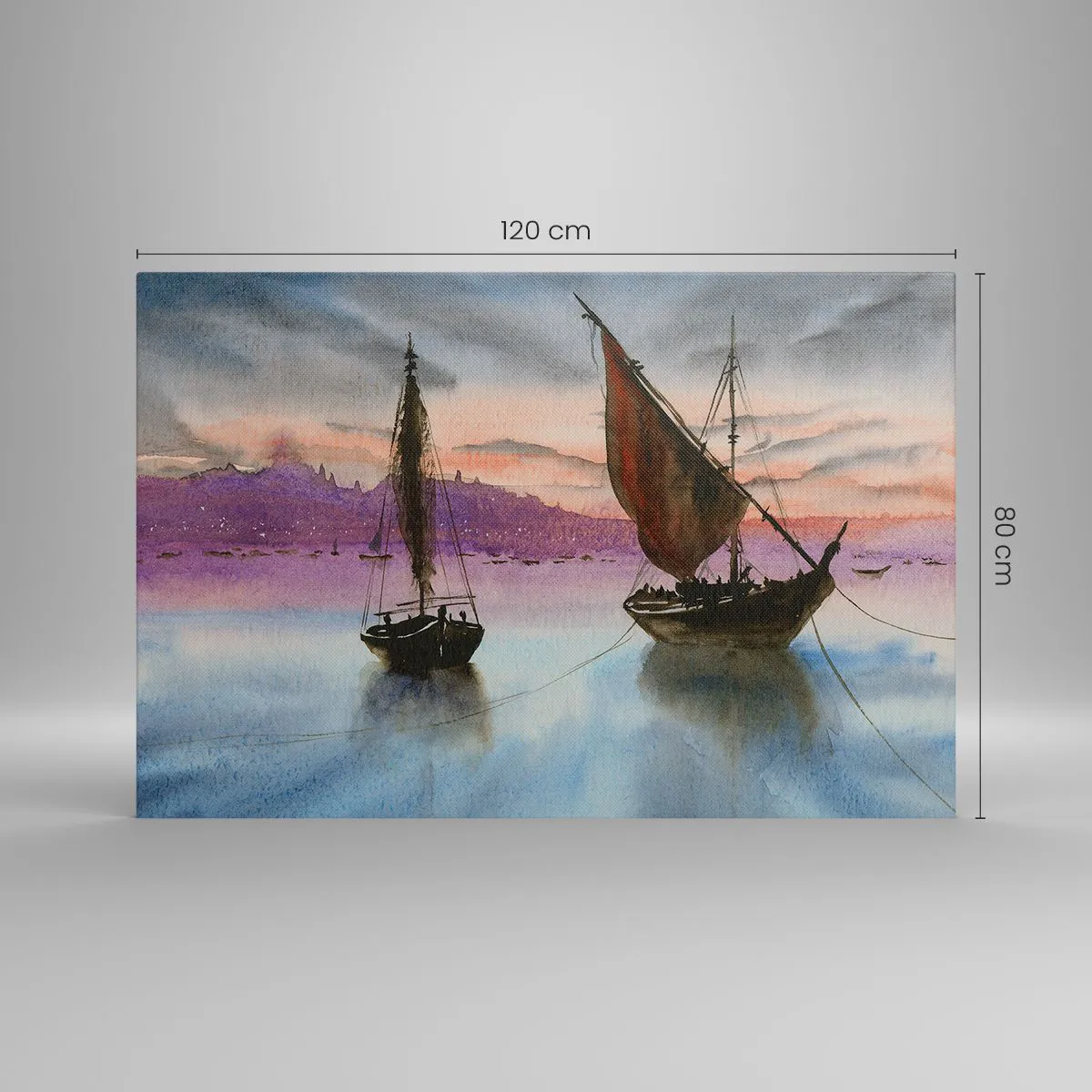 Bild auf Leinwand - Leinwandbild - Zwei Segelschiffe liegen in der Abenddämmerung auf ruhigem Wasser vor Anker - 120x80cm - Abend am Hafen - Moderne Wanddekoration für Wohnzimmer und Schlafzimmer ARTTOR