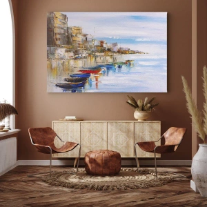 Das Motiv des Gemäldes vereint die Energie der Stadt und die Ruhe des Wassers und bringt Harmonie und Ausgeglichenheit in Innenräume. Spiegelungen auf der Wasseroberfläche und bunte Boote erzeugen eine dynamische und inspirierende Komposition, die den Blick auf sich zieht und die Fantasie anregt.