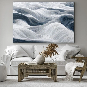 - Dieser 70 x 50 cm große Leinwanddruck zeigt Wellenlinien in Blau- und Weißtönen. Perfekt für moderne Innenräume, bringt er Harmonie und subtilen künstlerischen Ausdruck.