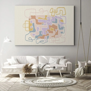 - Dieser 70 x 50 cm große Leinwanddruck zeigt pastellfarbene abstrakte Linien, die geometrische Muster bilden. Perfekt für moderne Innenräume, bringt es Subtilität und Harmonie.