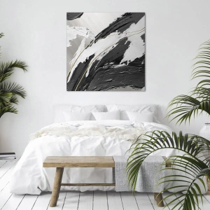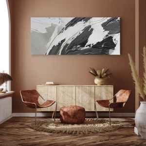 Bild auf Leinwand - Leinwandbild - Schwarze und weiße Pinselstriche mit einem subtilen goldenen Akzent - 80x120cm - Abstraktion in großem Stil - Moderne Wanddekoration für Wohnzimmer und Schlafzimmer ARTTOR