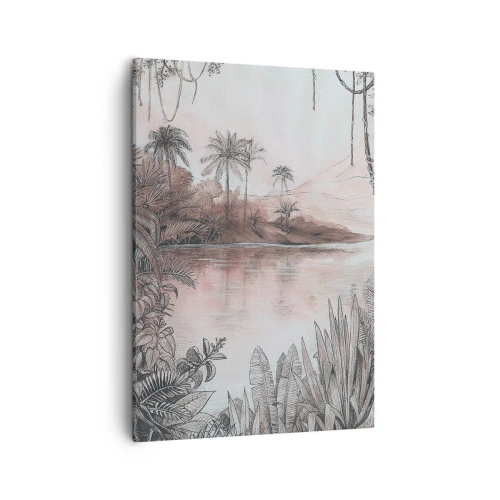Die Leinwand wird über den Rahmen gespannt. Die Seiten und Kanten werden gedruckt, um das Bild fortzusetzen. Das Bild ist fertig zum Aufhängen an der Wand. Jedes Produkt hat einen am Rahmen befestigten Anhänger und ein Montageset (Schraube + Stift).
