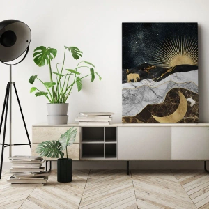 Die Leinwand wird über den Rahmen gespannt. Die Seiten und Kanten werden gedruckt, um das Bild fortzusetzen. Das Bild ist fertig zum Aufhängen an der Wand. Jedes Produkt hat einen am Rahmen befestigten Anhänger und ein Montageset (Schraube + Stift).