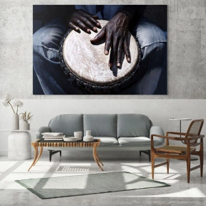 Glasbild - Bild auf glas - Nahaufnahme von Händen, die eine Djembe-Trommel spielen - 100x70cm - Lebe in deinem eigenen Rhythmus - Moderne Wanddekoration für Wohnzimmer und Schlafzimmer ARTTOR