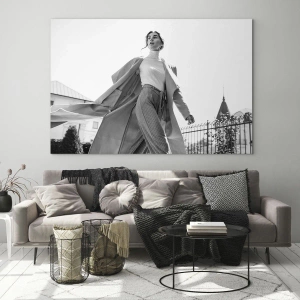 Glasbild - Bild auf glas - Stilvolle Frau im Mantel vor schwarz-weißem Architekturhintergrund - 70x100cm - Gehst du mit mir? - Moderne Wanddekoration für Wohnzimmer und Schlafzimmer ARTTOR