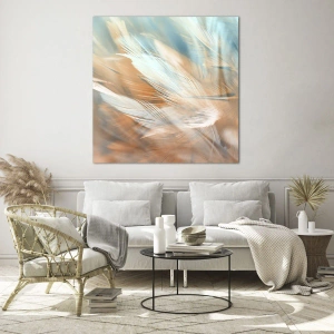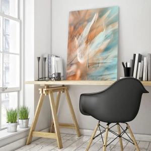 Glasbild - Bild auf glas - Zarte Federn in Pastelltönen von Blau und Orange - 120x50cm - Im Land der Sanftmut - Moderne Wanddekoration für Wohnzimmer und Schlafzimmer ARTTOR