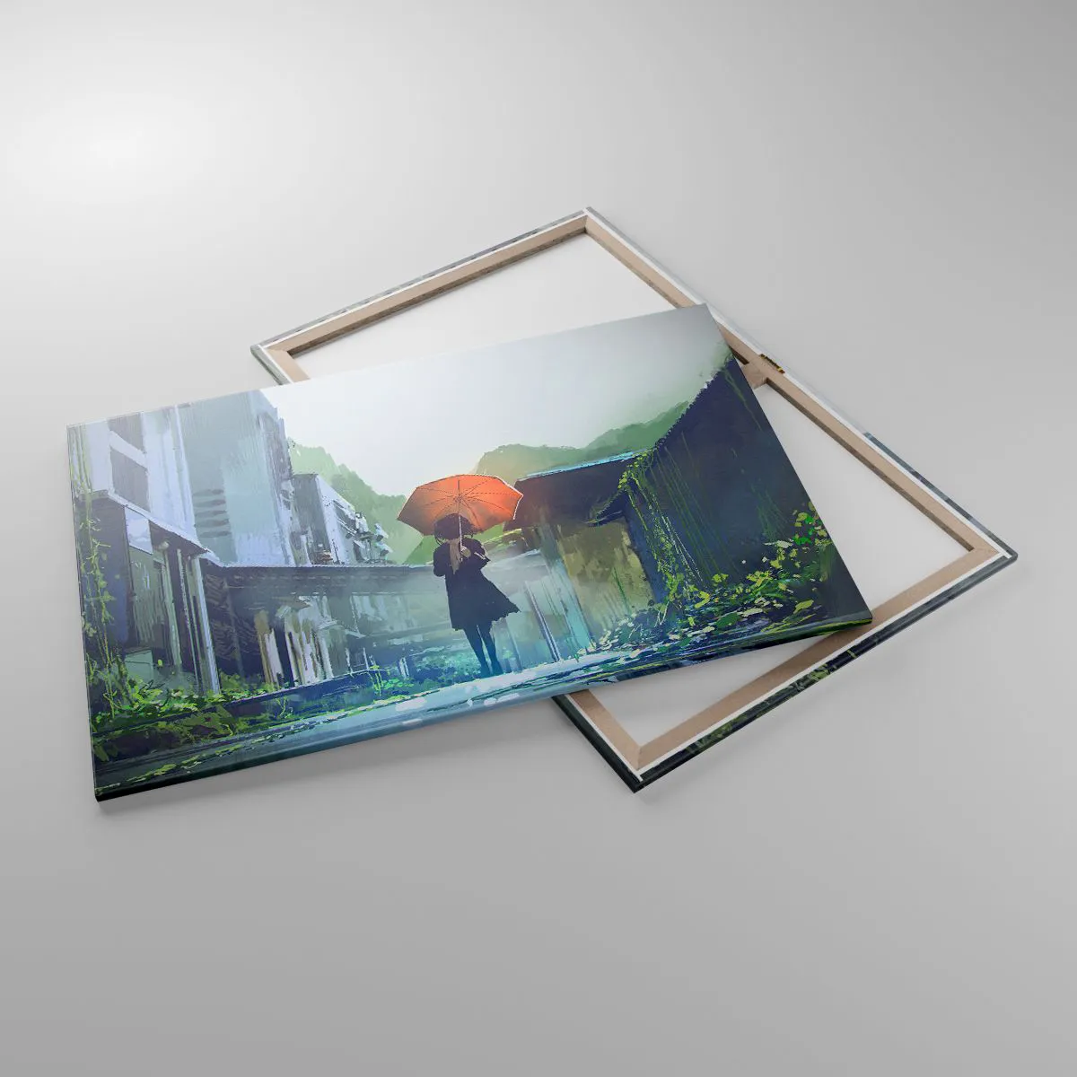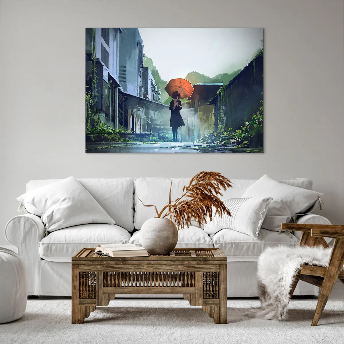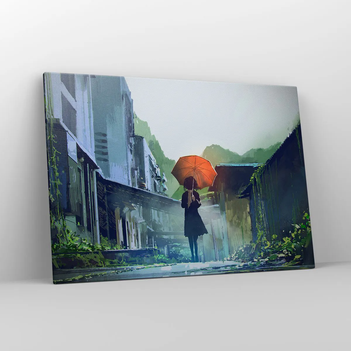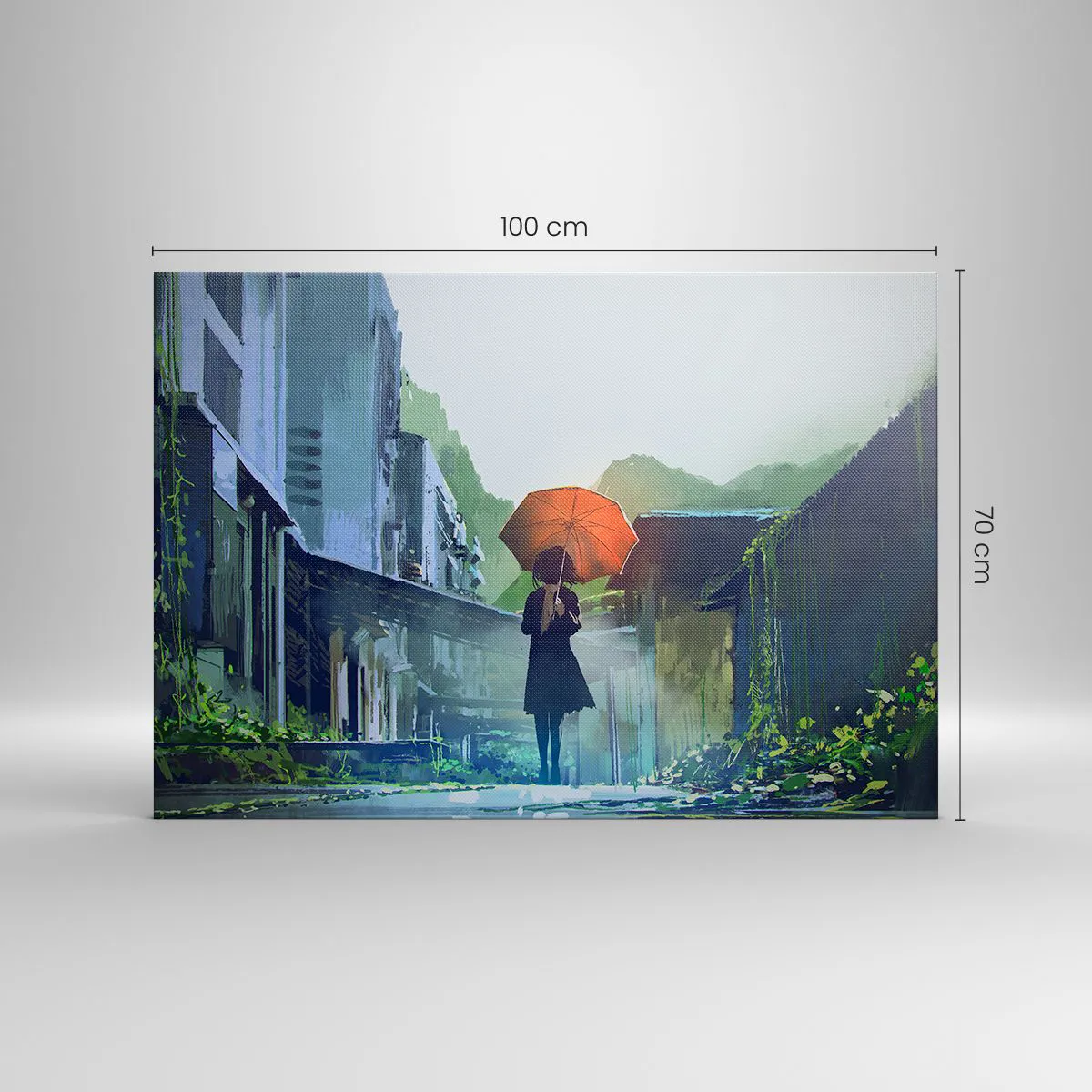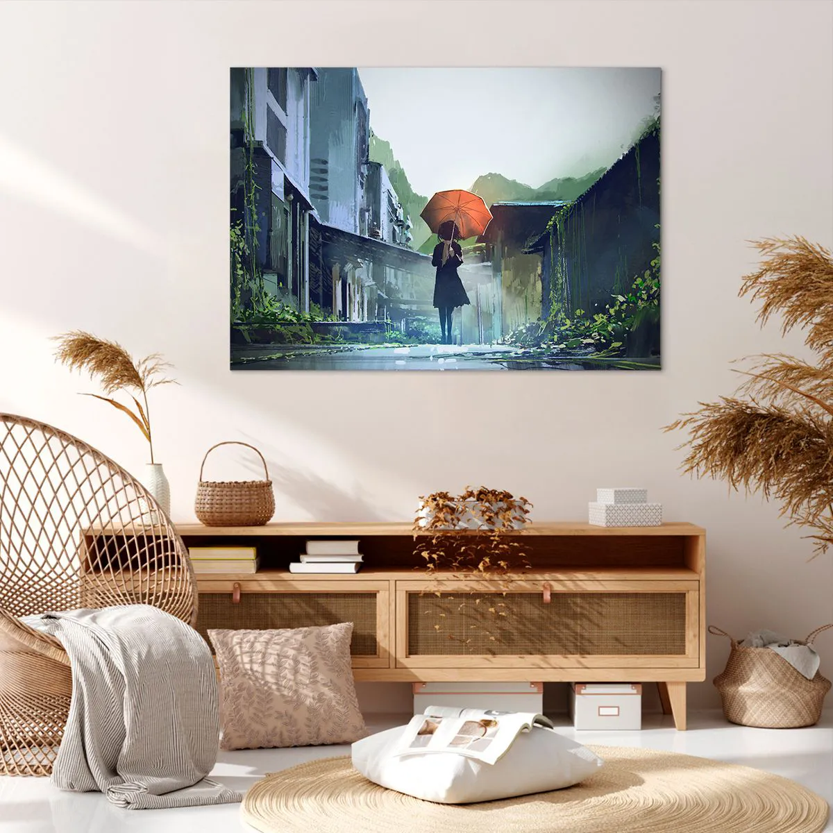 Bild auf Leinwand - Leinwandbild - Eine Figur mit einem Regenschirm in einer verregneten Stadt - 100x70cm - Belebender Regen - Moderne Wanddekoration für Wohnzimmer und Schlafzimmer ARTTOR