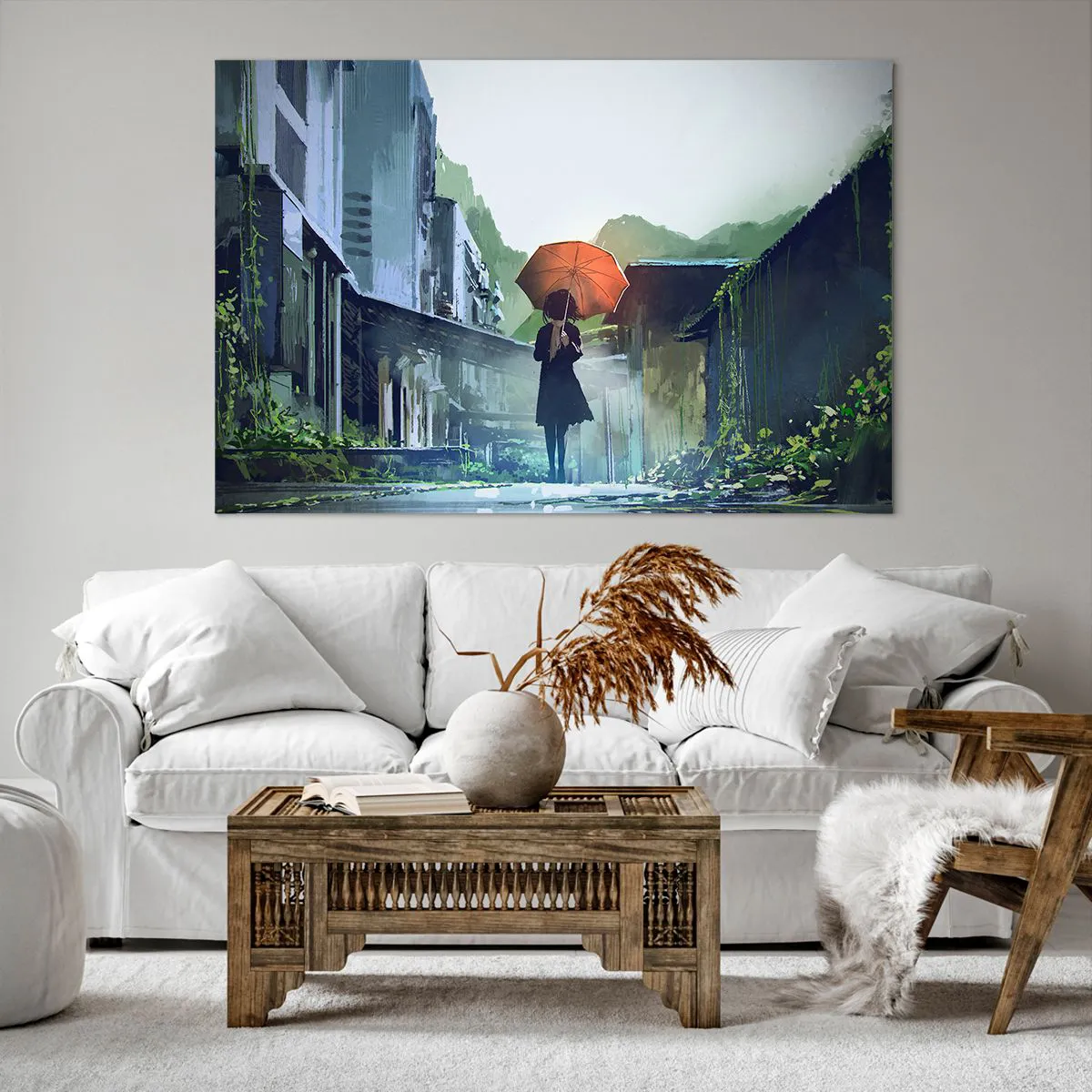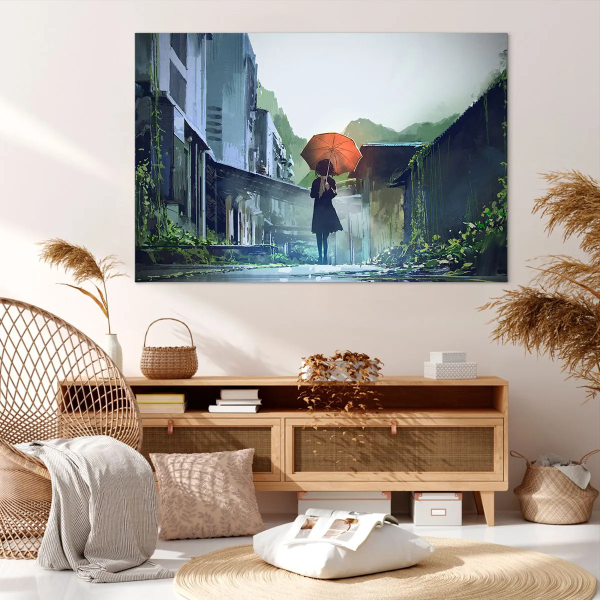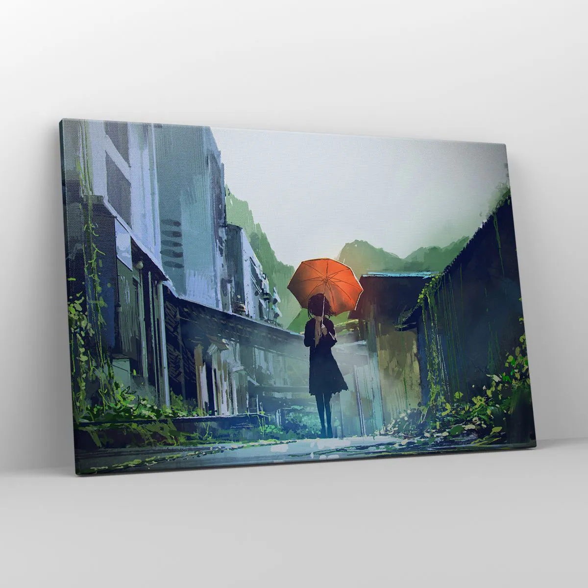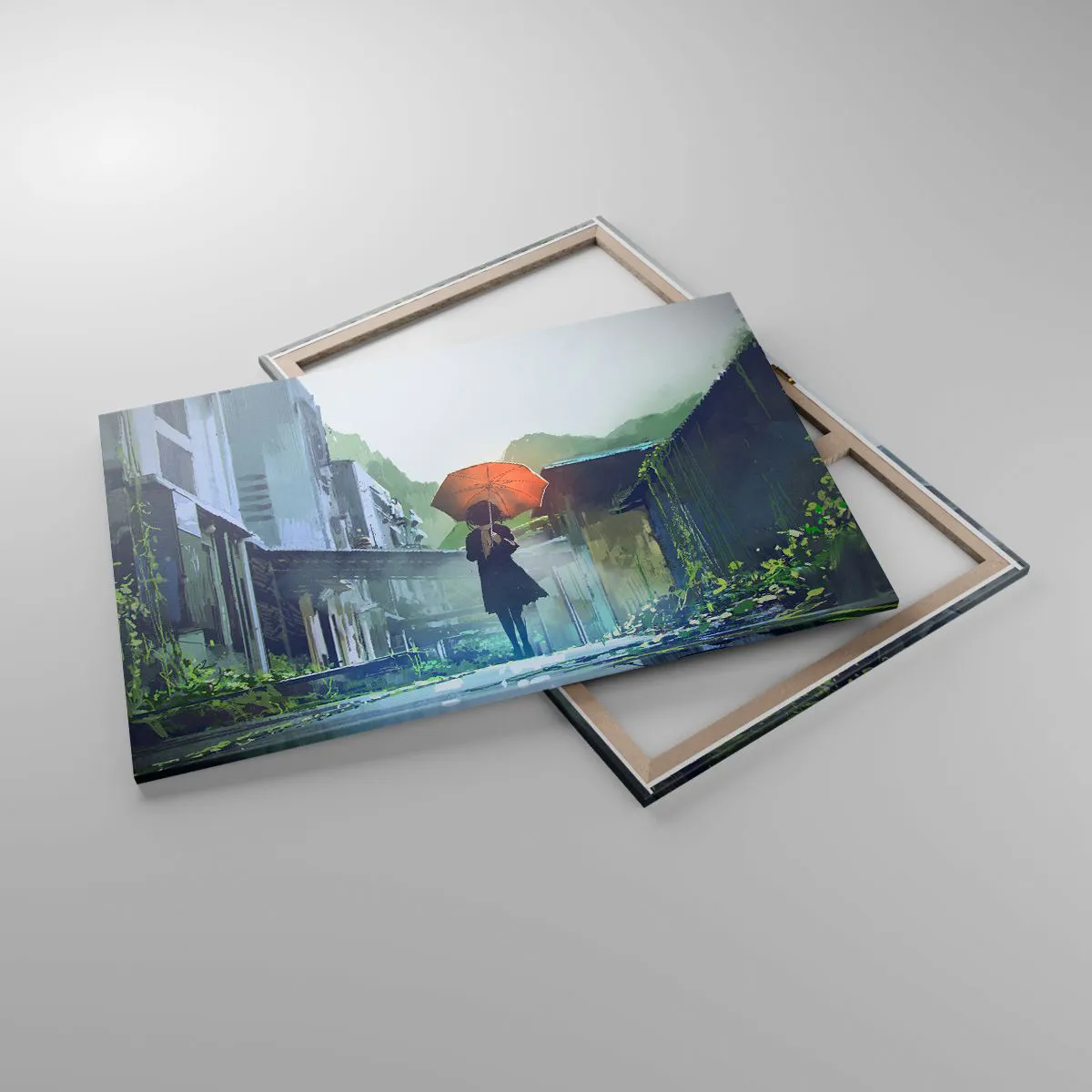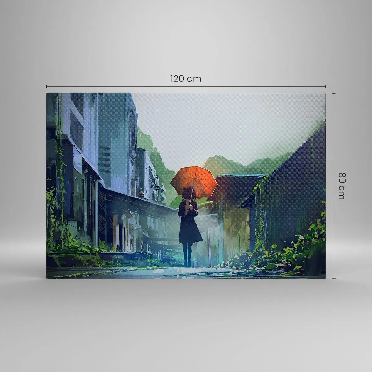 Bild auf Leinwand - Leinwandbild - Eine Figur mit einem Regenschirm in einer verregneten Stadt - 120x80cm - Belebender Regen - Moderne Wanddekoration für Wohnzimmer und Schlafzimmer ARTTOR