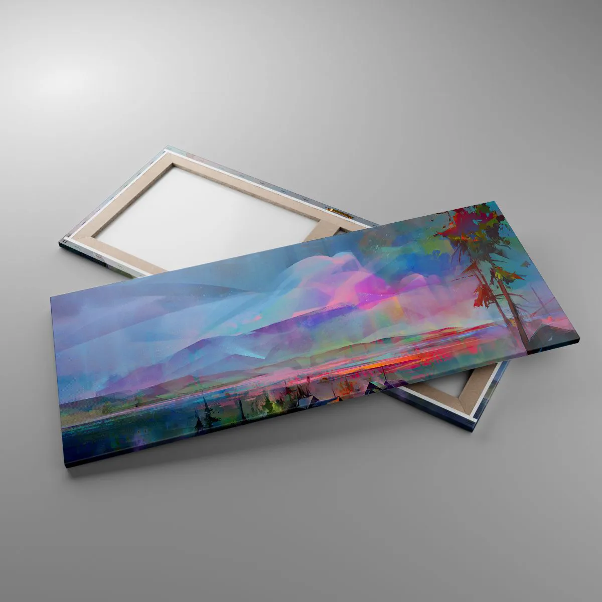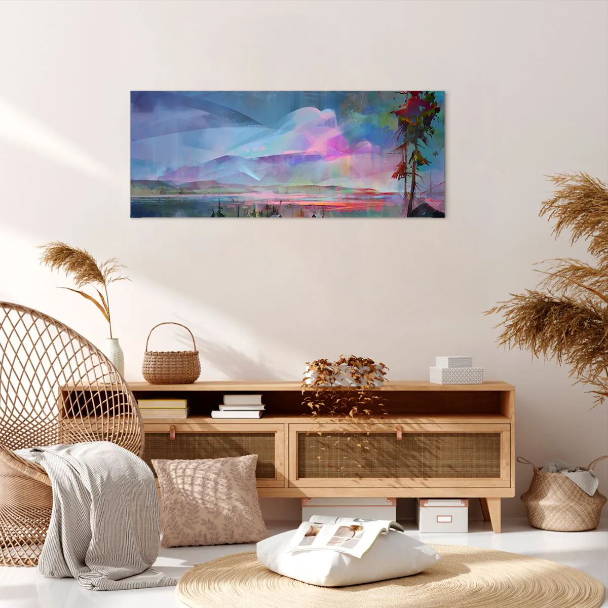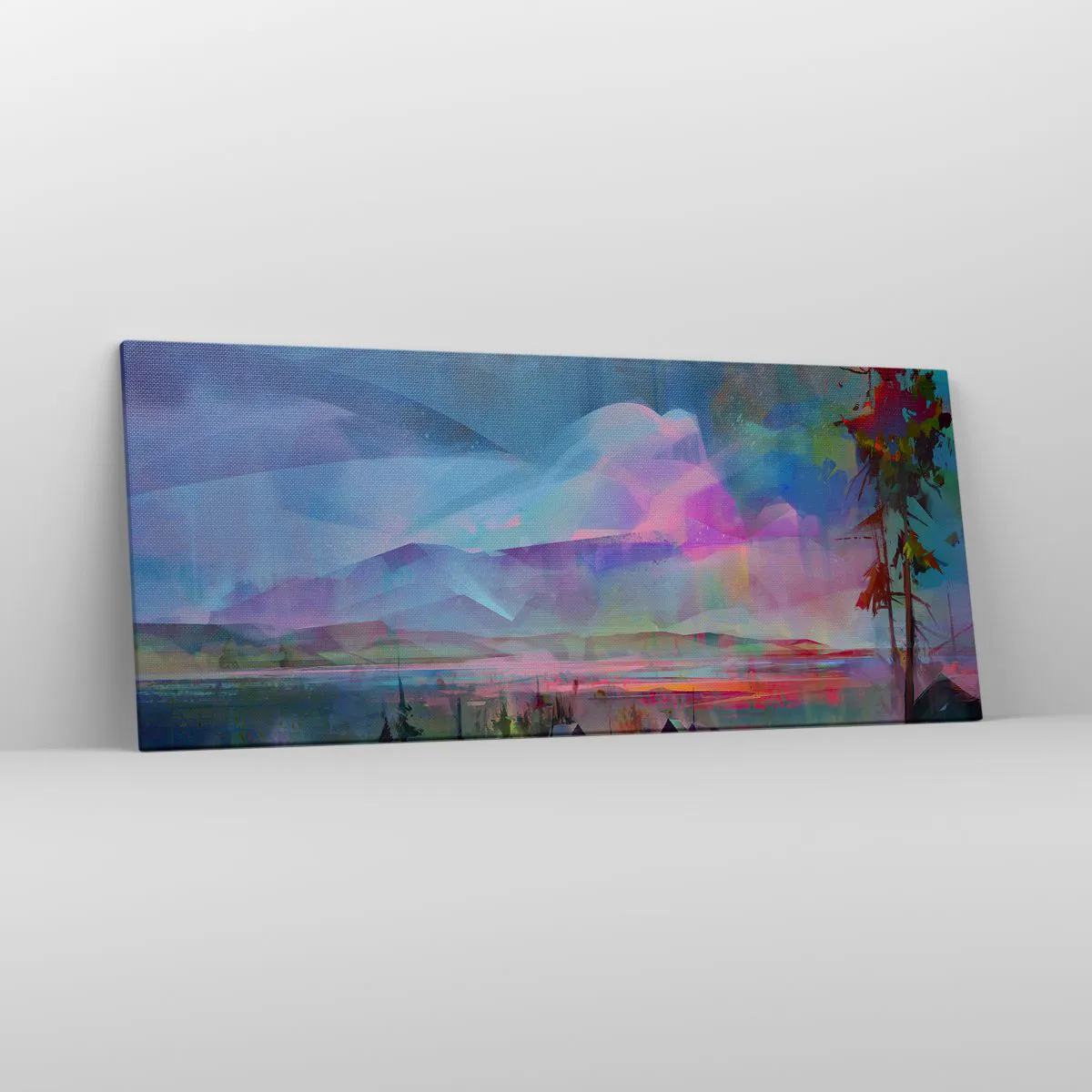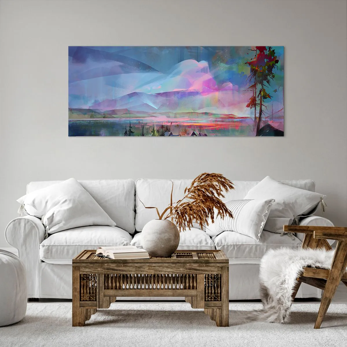 Bild auf Leinwand - Leinwandbild - Berglandschaft mit buntem Himmel und einem Dorf - 120x50cm - Unter einem wohlwollenden Himmel - Moderne Wanddekoration für Wohnzimmer und Schlafzimmer ARTTOR