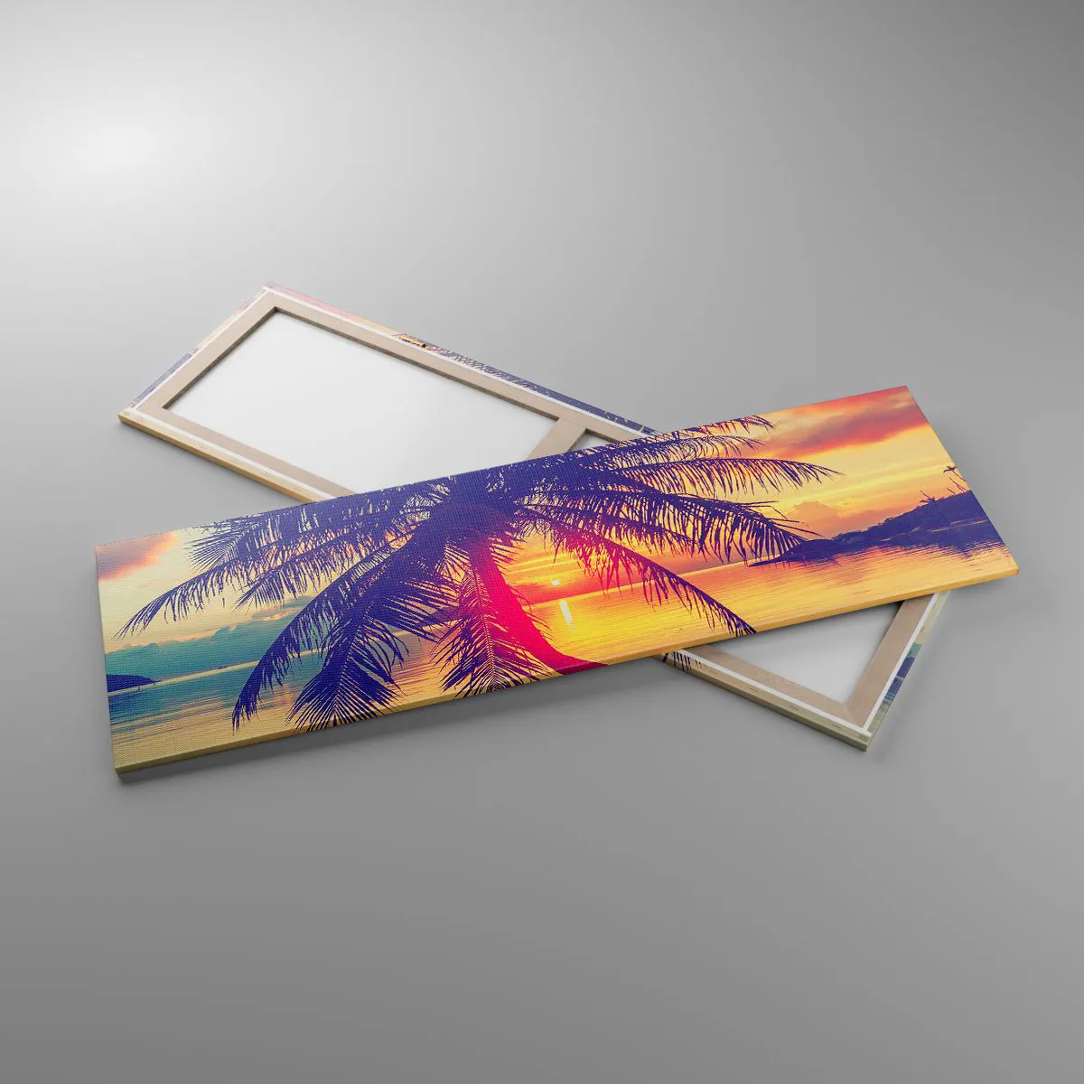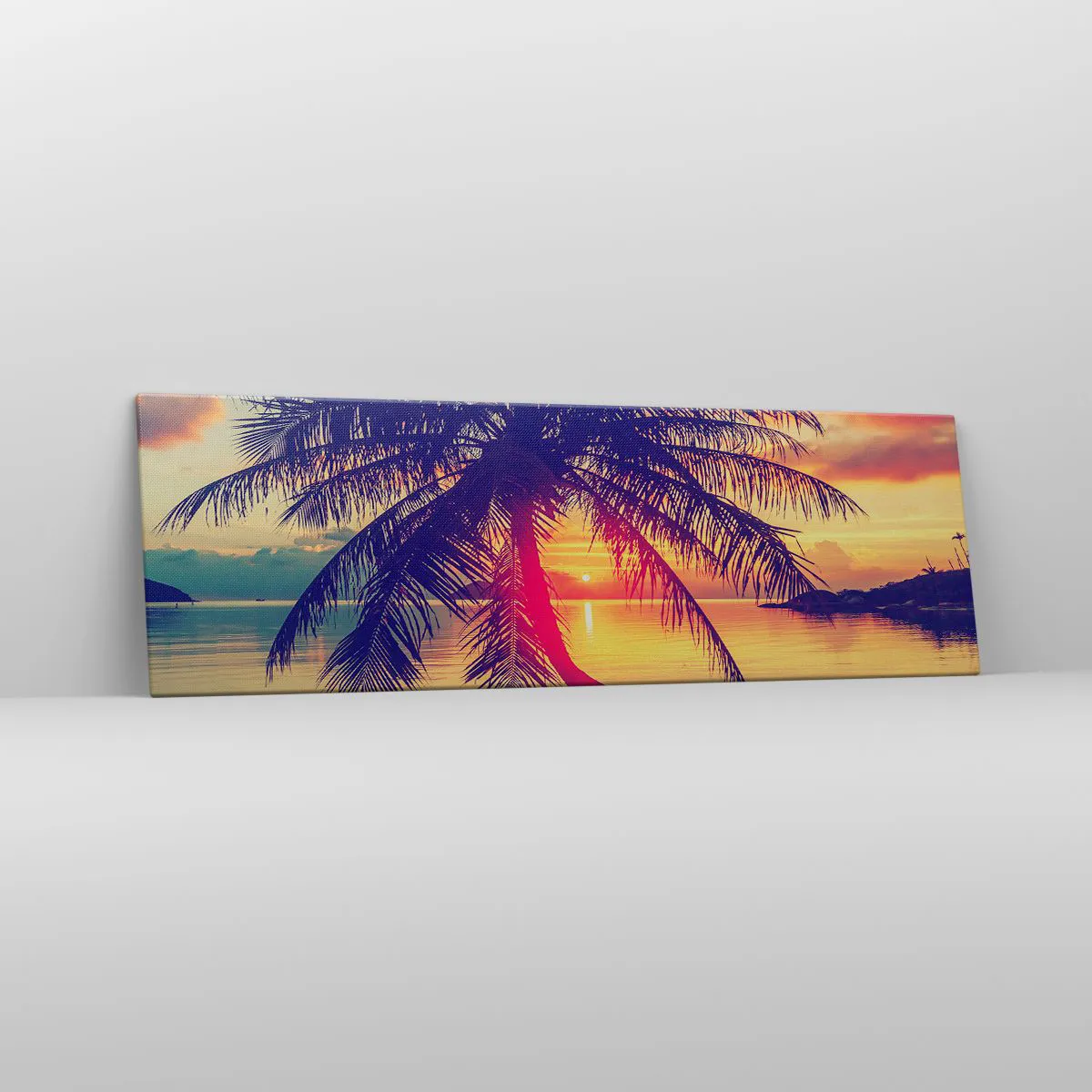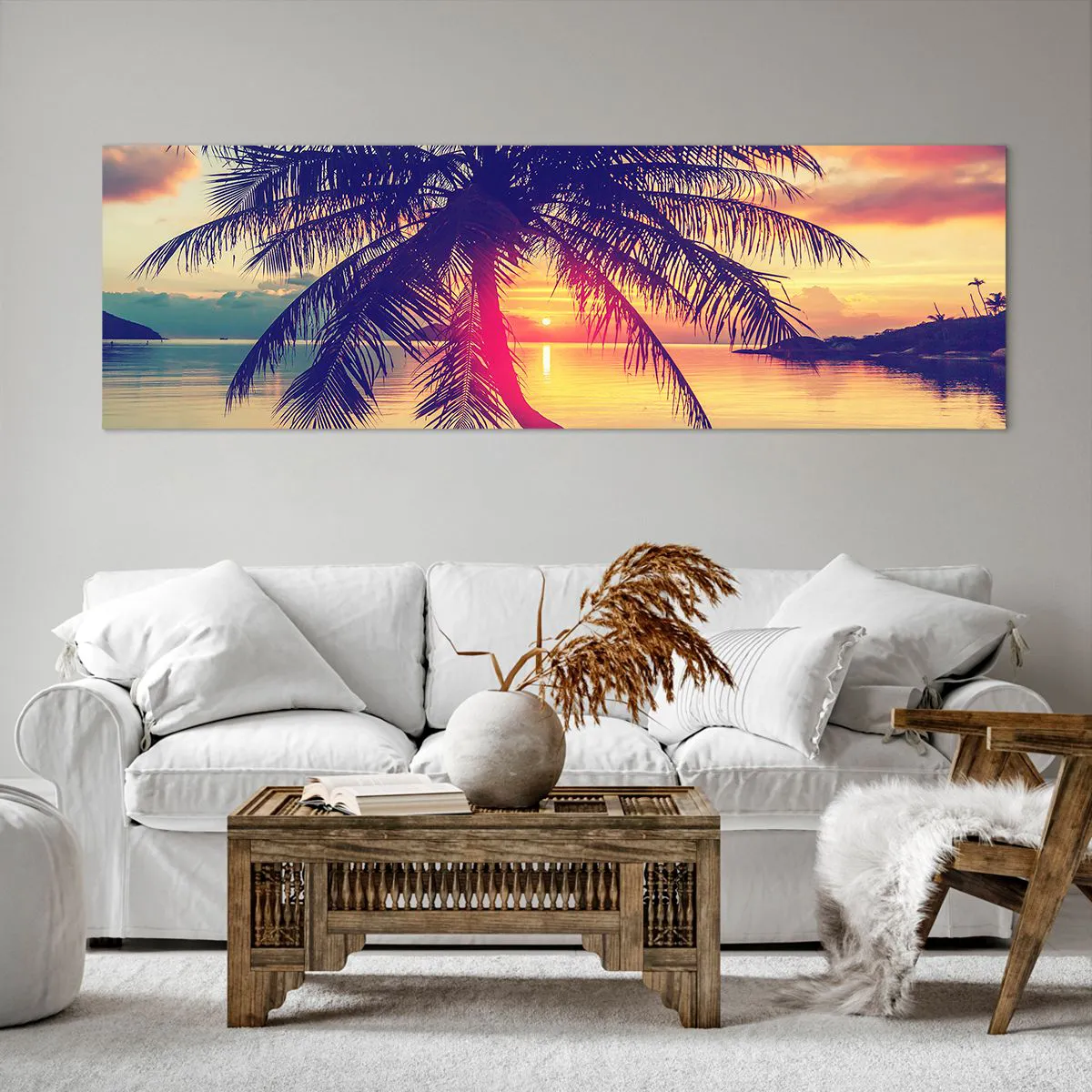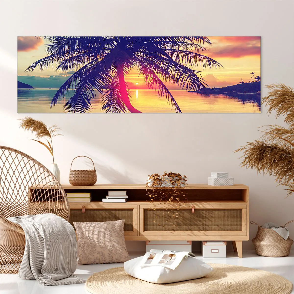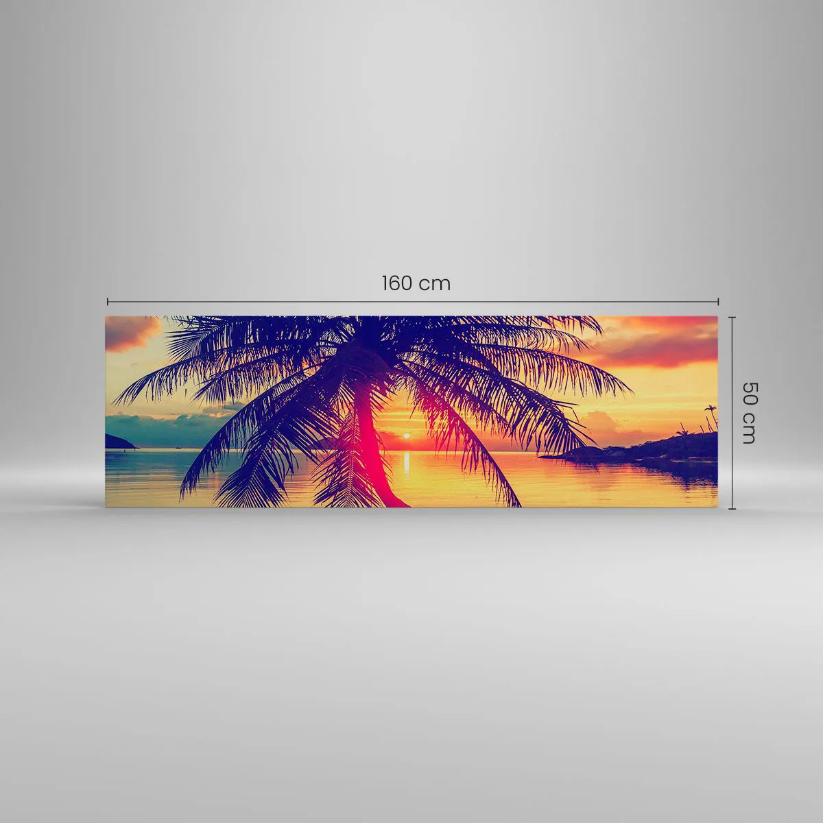 Bild auf Leinwand - Leinwandbild - Sonnenuntergang mit einer Palme über einem ruhigen Ufer - 160x50cm - Abend unter Palmen - Moderne Wanddekoration für Wohnzimmer und Schlafzimmer ARTTOR