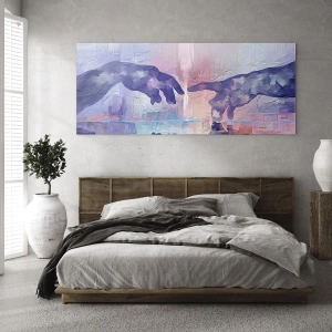 Glasbild - Bild auf glas - Abstrakte Hände nähern sich einander vor einem pastellfarbenen Hintergrund. - 70x50cm - Göttlicher Funke des Lebens - Moderne Wanddekoration für Wohnzimmer und Schlafzimmer ARTTOR