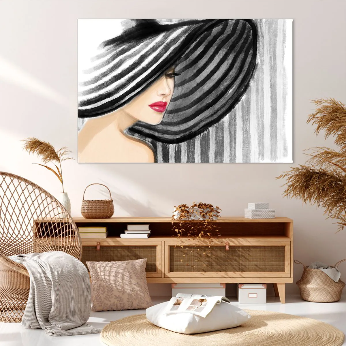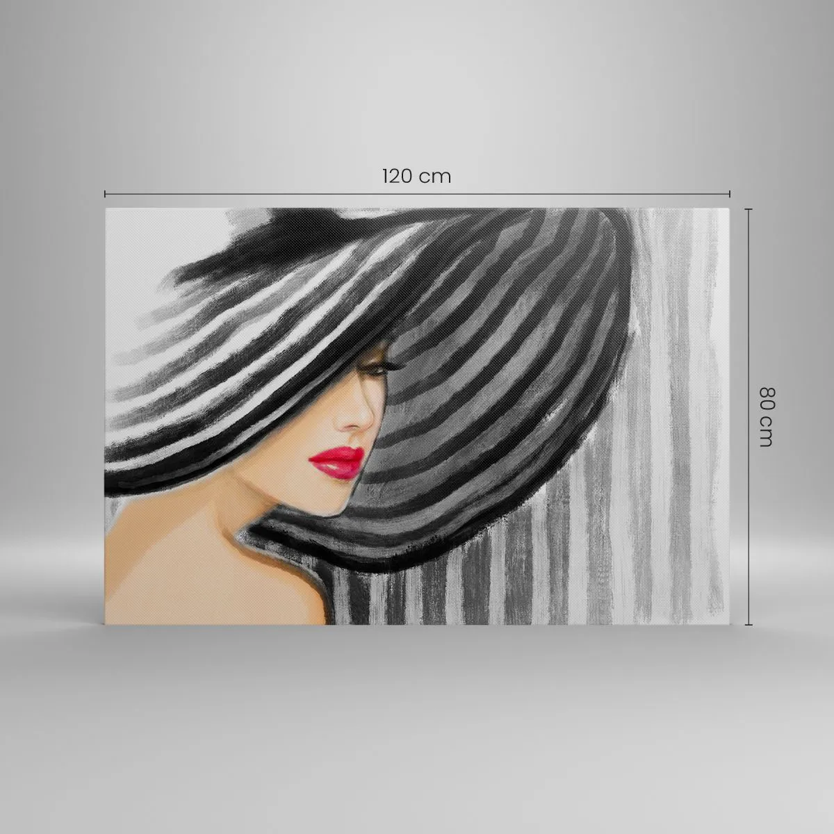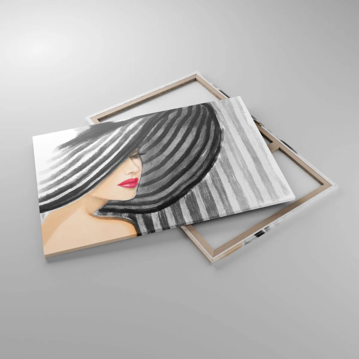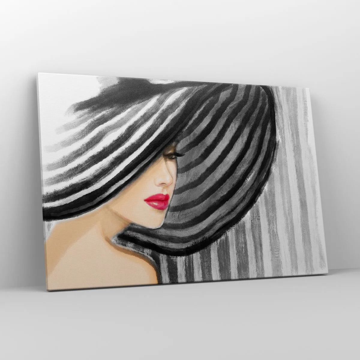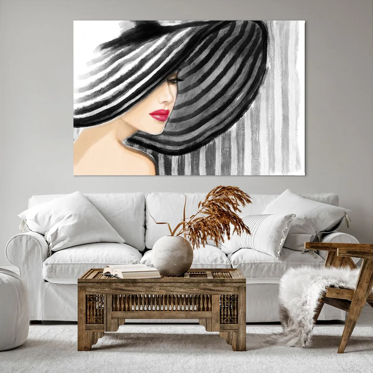 Bild auf Leinwand - Leinwandbild - Frau trägt einen schwarz-weißen Hut mit rotem Akzent - 120x80cm - Wo soll ich dich finden? - Moderne Wanddekoration für Wohnzimmer und Schlafzimmer ARTTOR