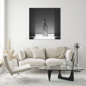 Glasbild - Bild auf glas - Ein Schwarzweißfoto einer Frau in einem Kleid vor einem hellen Hintergrund. - 50x70cm - Raffinierte Einfachheit - Moderne Wanddekoration für Wohnzimmer und Schlafzimmer ARTTOR