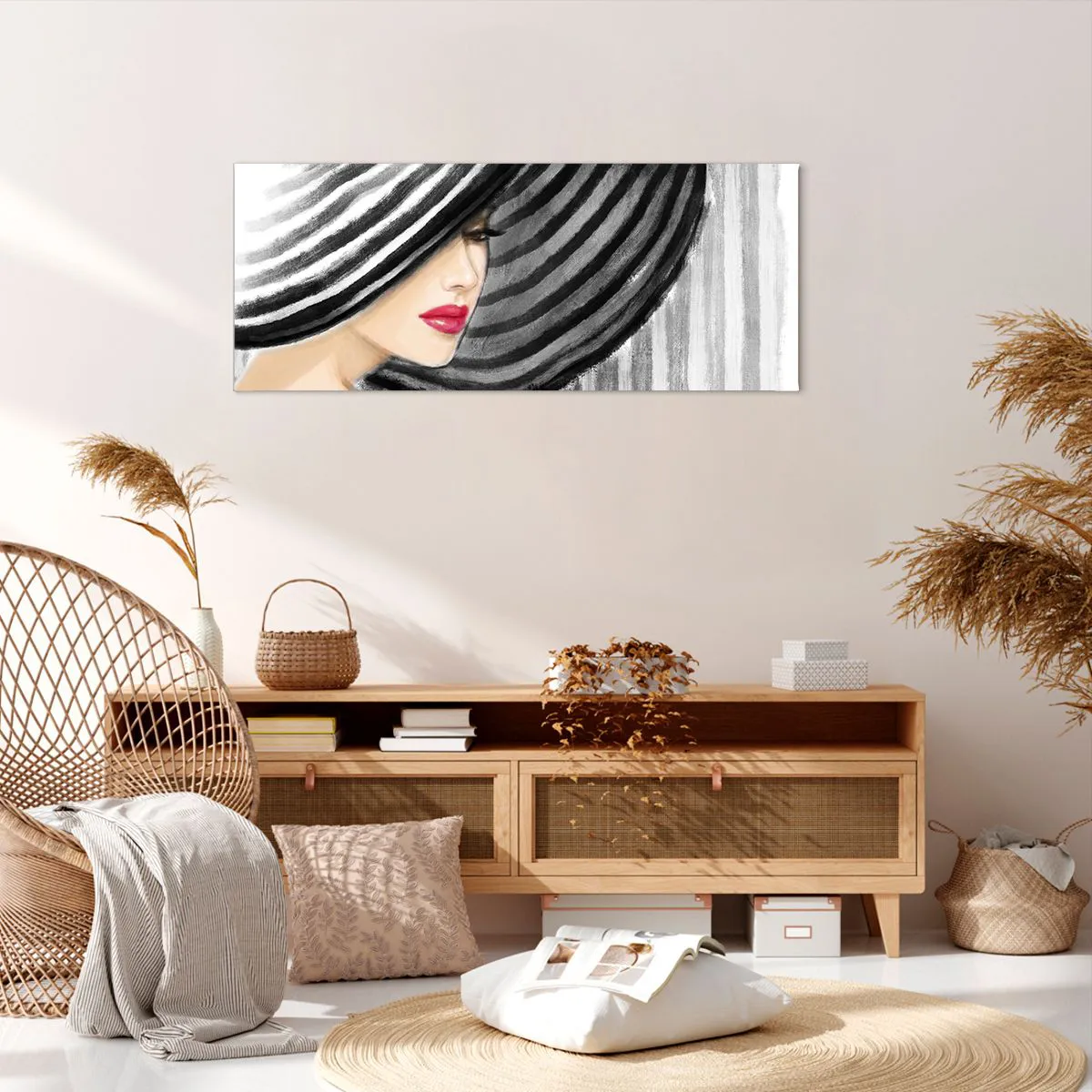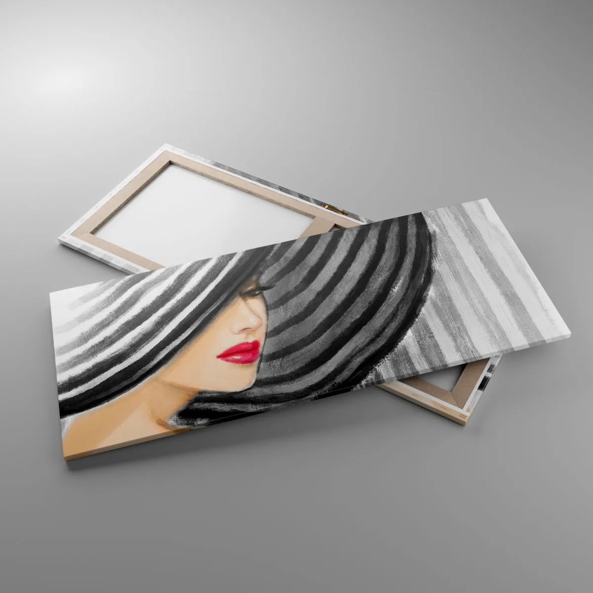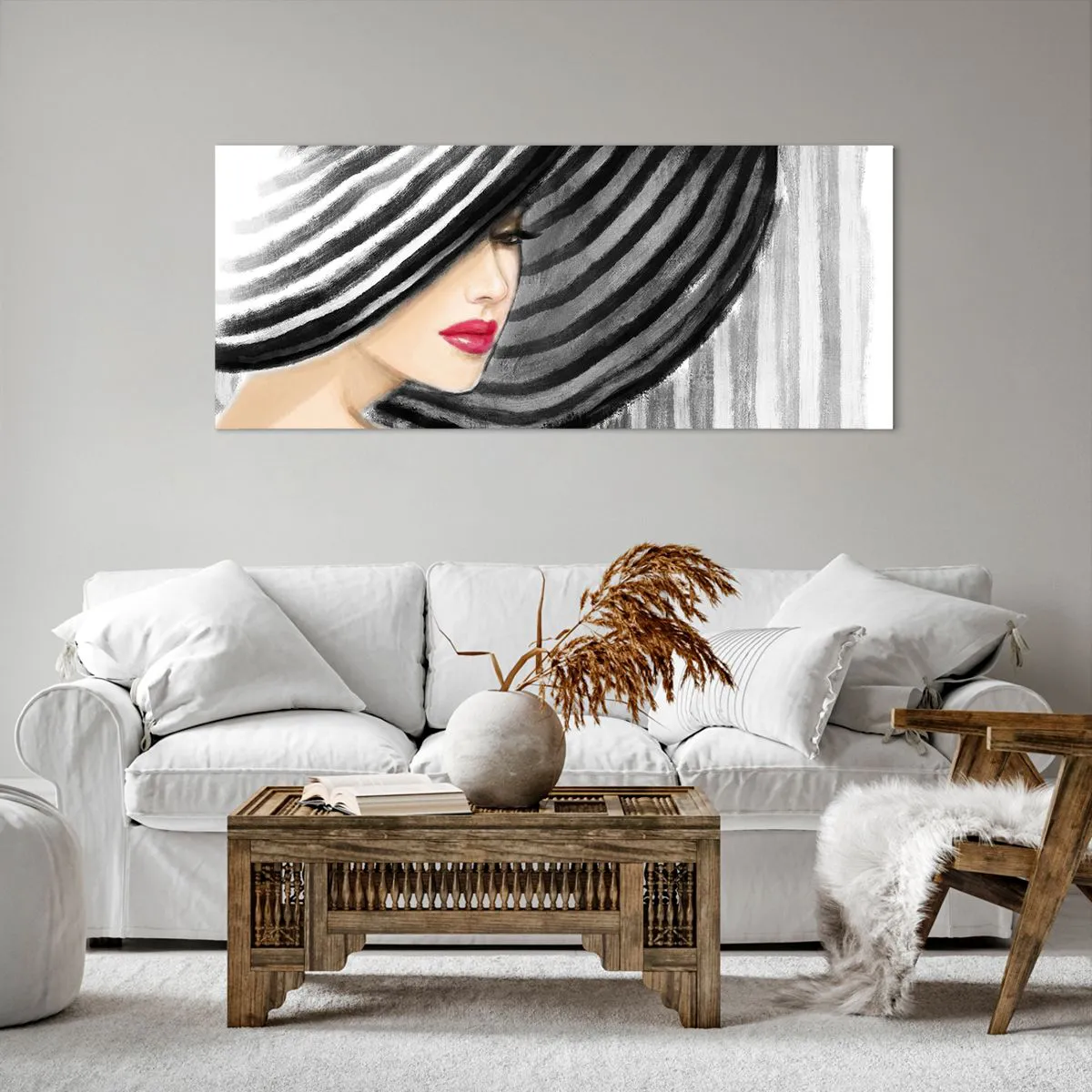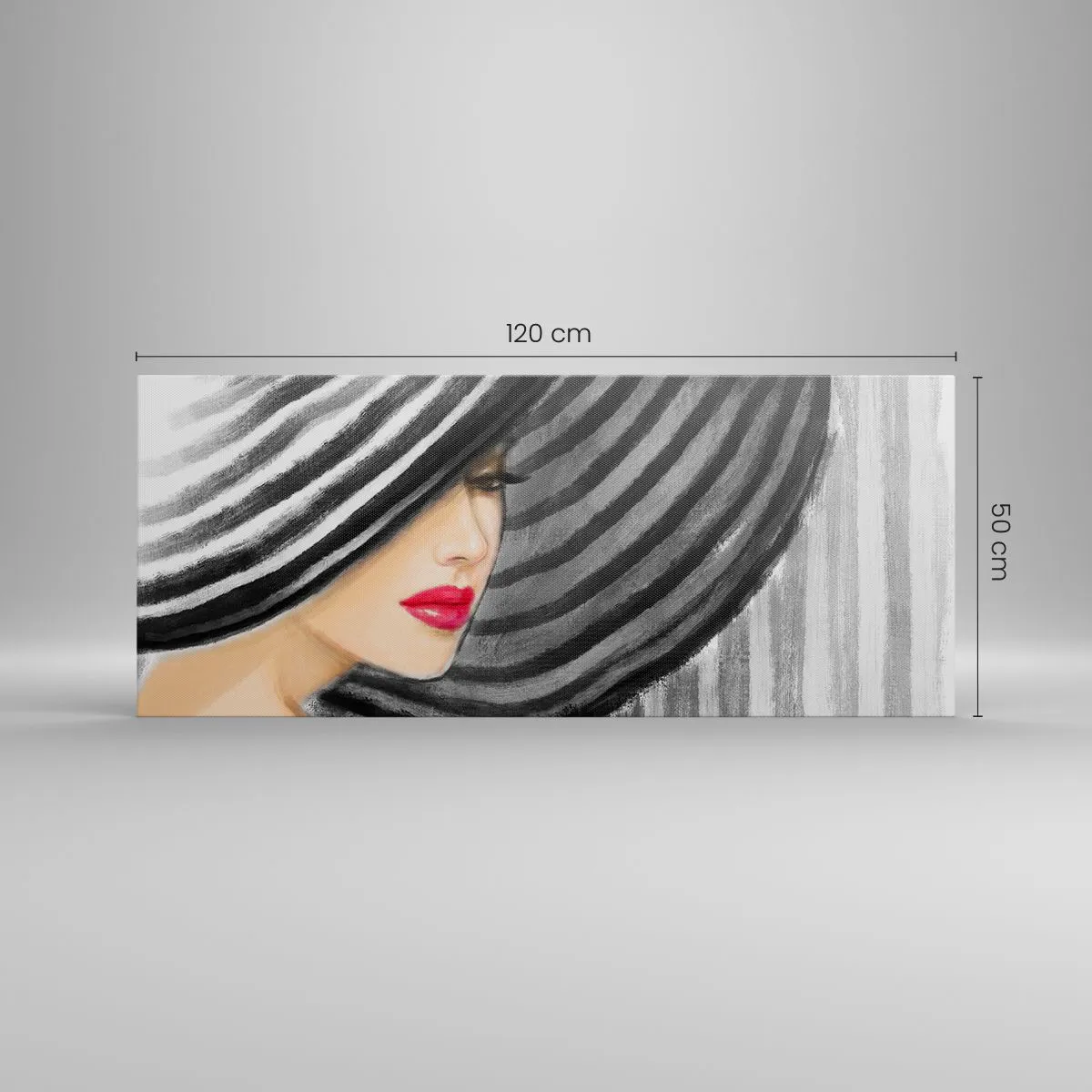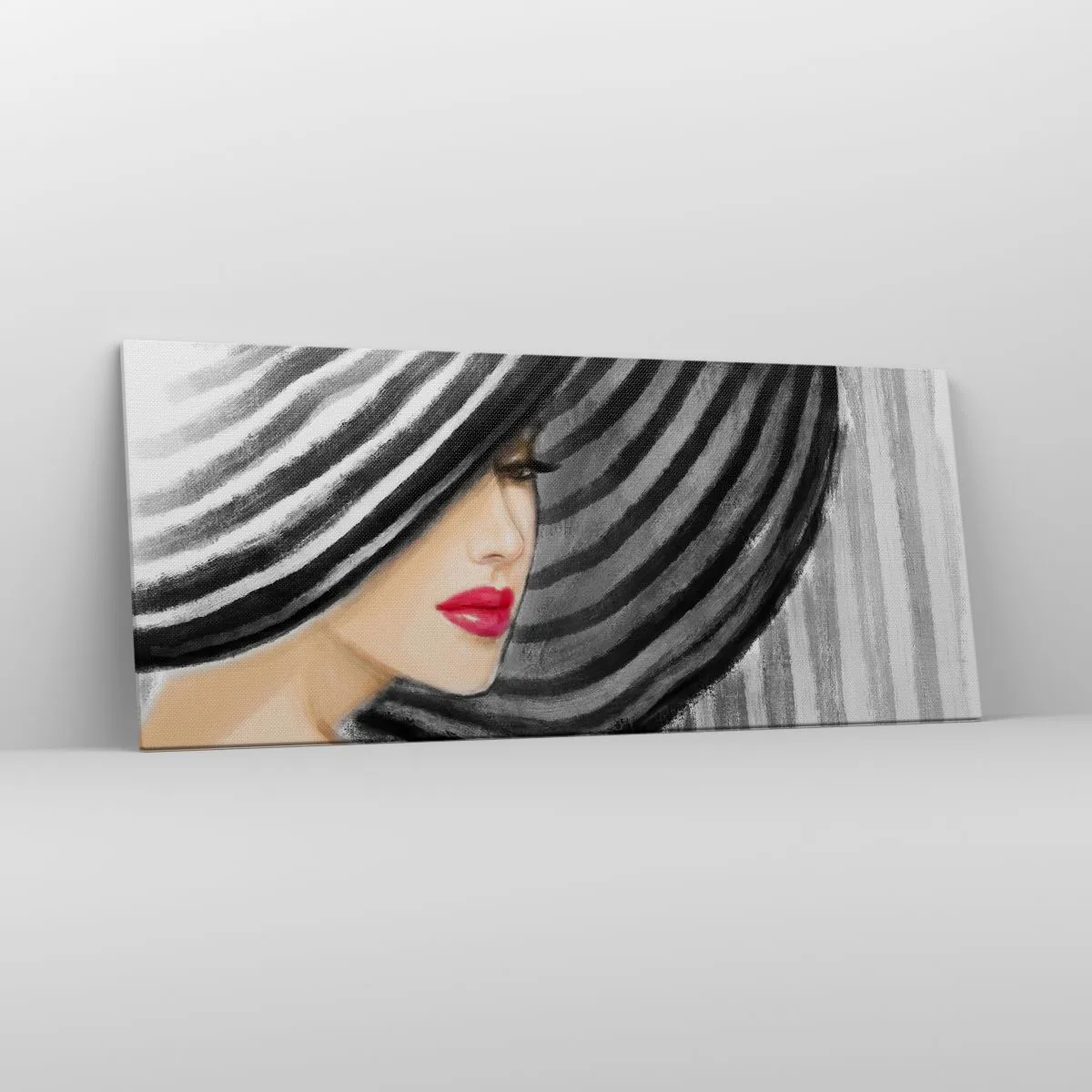 Bild auf Leinwand - Leinwandbild - Frau trägt einen schwarz-weißen Hut mit rotem Akzent - 120x50cm - Wo soll ich dich finden? - Moderne Wanddekoration für Wohnzimmer und Schlafzimmer ARTTOR