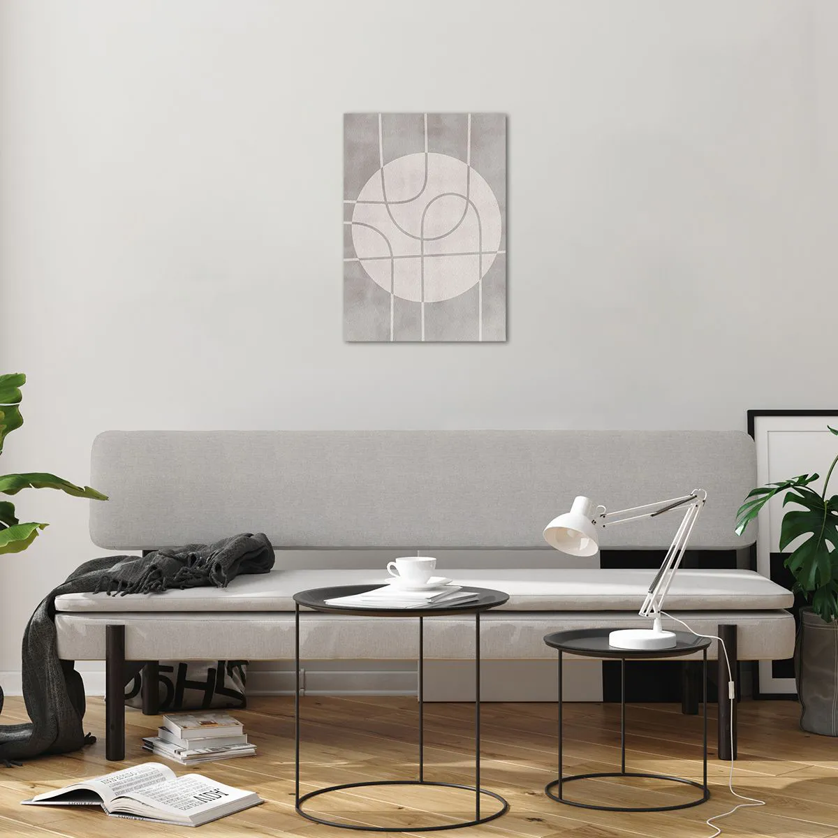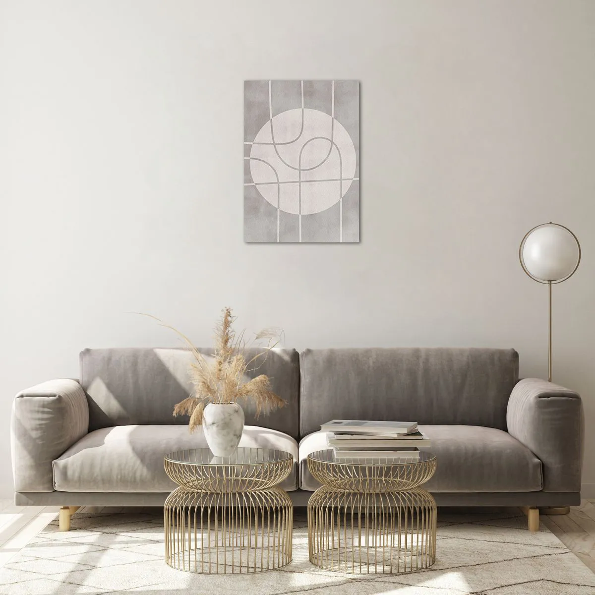 • Eine geometrische Komposition aus hellen Linien und Kreisen auf grauem Hintergrund. Ein modernes, minimalistisches Design, perfekt für zeitgenössische Innenräume.