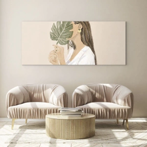 • Ein stilisiertes Porträt einer Frau mit langen Haaren, die vor einem hellen Hintergrund ein grünes Blatt vor ihr Gesicht hält. Dieses Gemälde in zarten Beige- und Grüntönen eignet sich perfekt für Innenräume, die von der Natur und dem Boho-Stil inspiri...