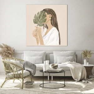Glasbild - Bild auf glas - Eine Frau mit langen Haaren hält ein Blatt vor ihr Gesicht. - 50x70cm - Geheimnisvolles Porträt mit Fächer - Moderne Wanddekoration für Wohnzimmer und Schlafzimmer ARTTOR