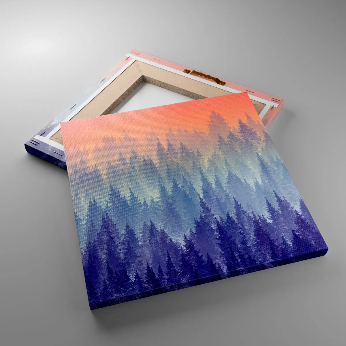 Die Leinwand wird über den Rahmen gespannt. Die Seiten und Kanten werden gedruckt, um das Bild fortzusetzen. Das Bild ist fertig zum Aufhängen an der Wand. Jedes Produkt hat einen am Rahmen befestigten Anhänger und ein Montageset (Schraube + Stift).