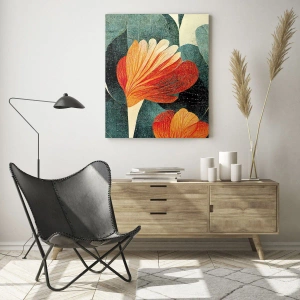 Glasbild - Bild auf glas - Orangefarbene Blüten vor einem Hintergrund aus dunkelgrünen Blättern - 50x70cm - Hitze der Tropen und Kühle des Grüns - Moderne Wanddekoration für Wohnzimmer und Schlafzimmer ARTTOR