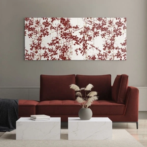 Die Farben sind in Rot- und Beigetönen gehalten und verleihen der Komposition ein harmonisches und natürliches Aussehen. Der verwitterte Hintergrund verleiht dem Bild Tiefe und die Pflanzenmotive gewinnen an Ausdruckskraft. Das Blumenmuster ist nicht aufdringlich, sondern überrascht mit seiner Zartheit und seinem Charme. Es ist eine Komposition, die Ruhe, Subtilität und ein wohnliches Gefühl in den Raum bringt.