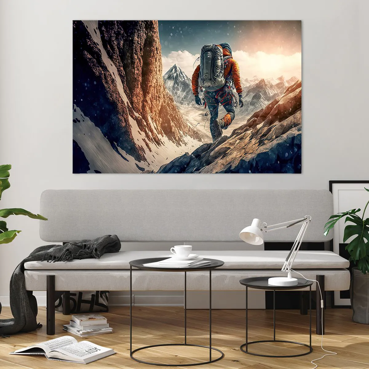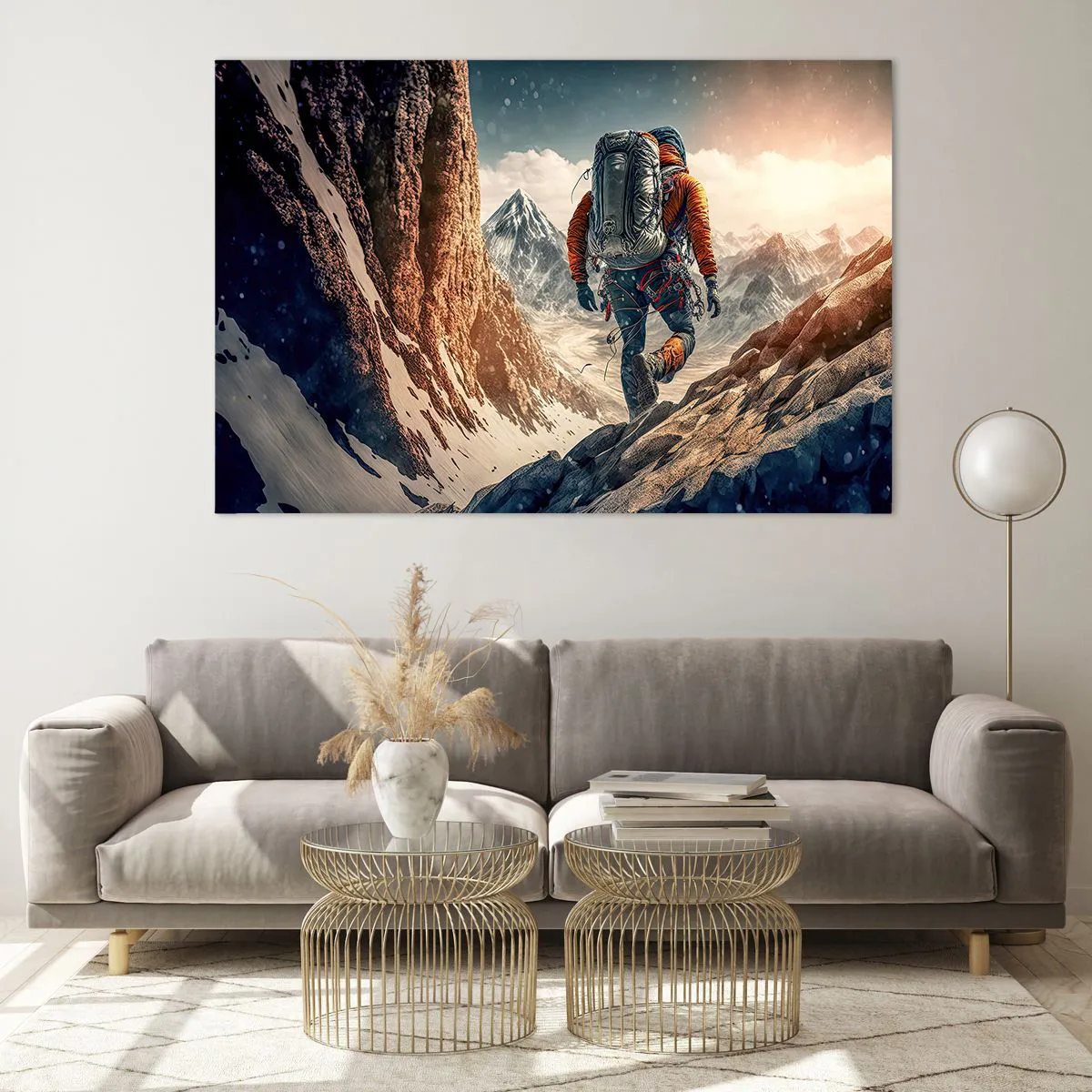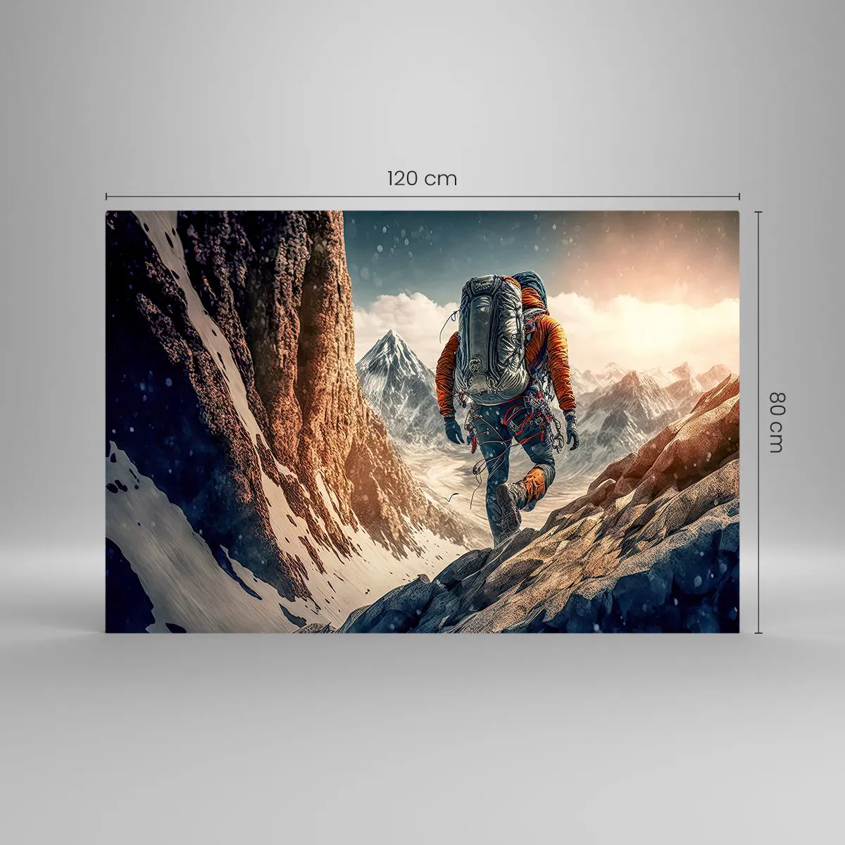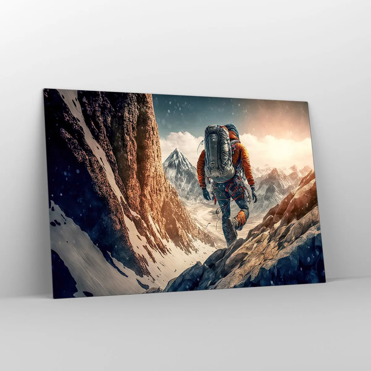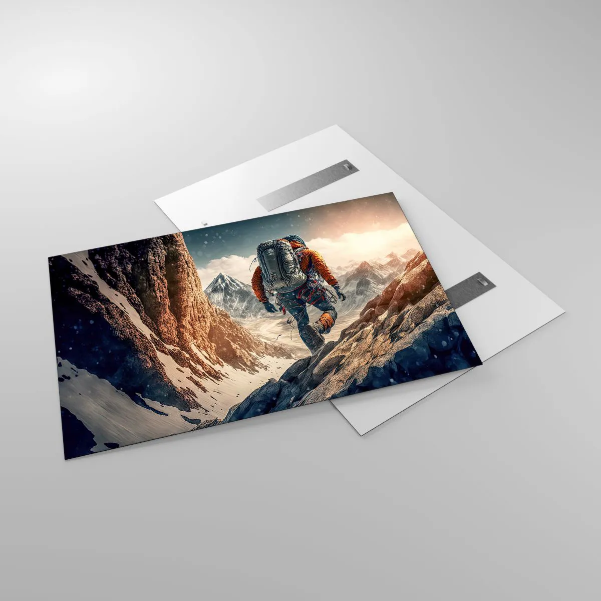Glasbild - Bild auf glas - Ein Wanderer erklimmt einen felsigen, schneebedeckten Berghang - 120x80cm - Einsamer Krieger - Moderne Wanddekoration für Wohnzimmer und Schlafzimmer ARTTOR