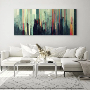 • Bunte vertikale Linien bilden die dynamische Silhouette einer futuristischen Stadt. Ein Bild voller Rhythmus, Energie und zeitgenössischem Design – perfekt für moderne Räume.
