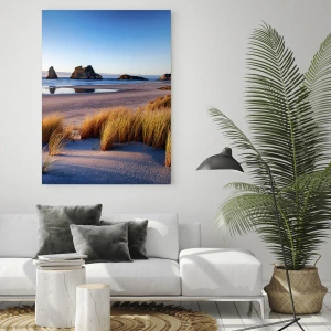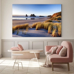 Glasbild - Bild auf glas - Ein Strand im Morgengrauen mit Gras und Felsen im Hintergrund und einem ruhigen Meer - 120x80cm - Für Friedenssuchende - Moderne Wanddekoration für Wohnzimmer und Schlafzimmer ARTTOR