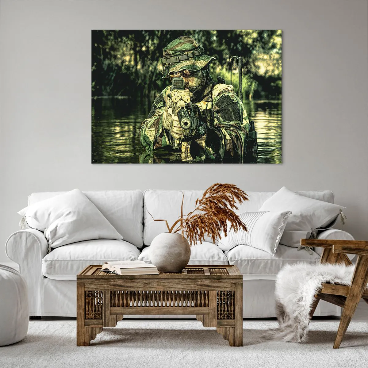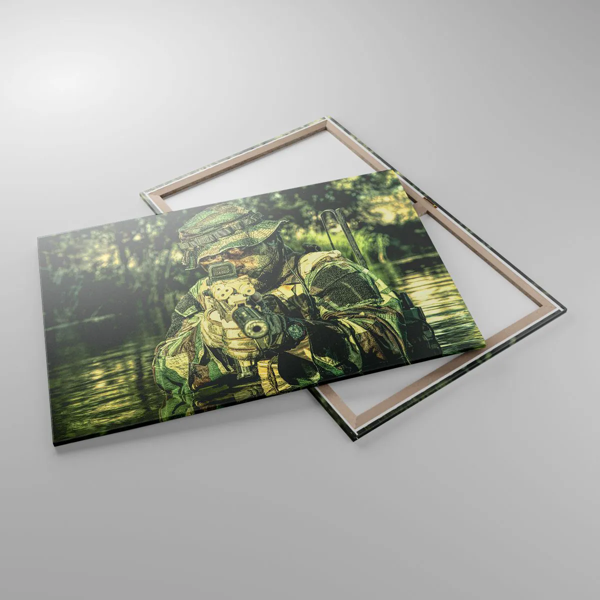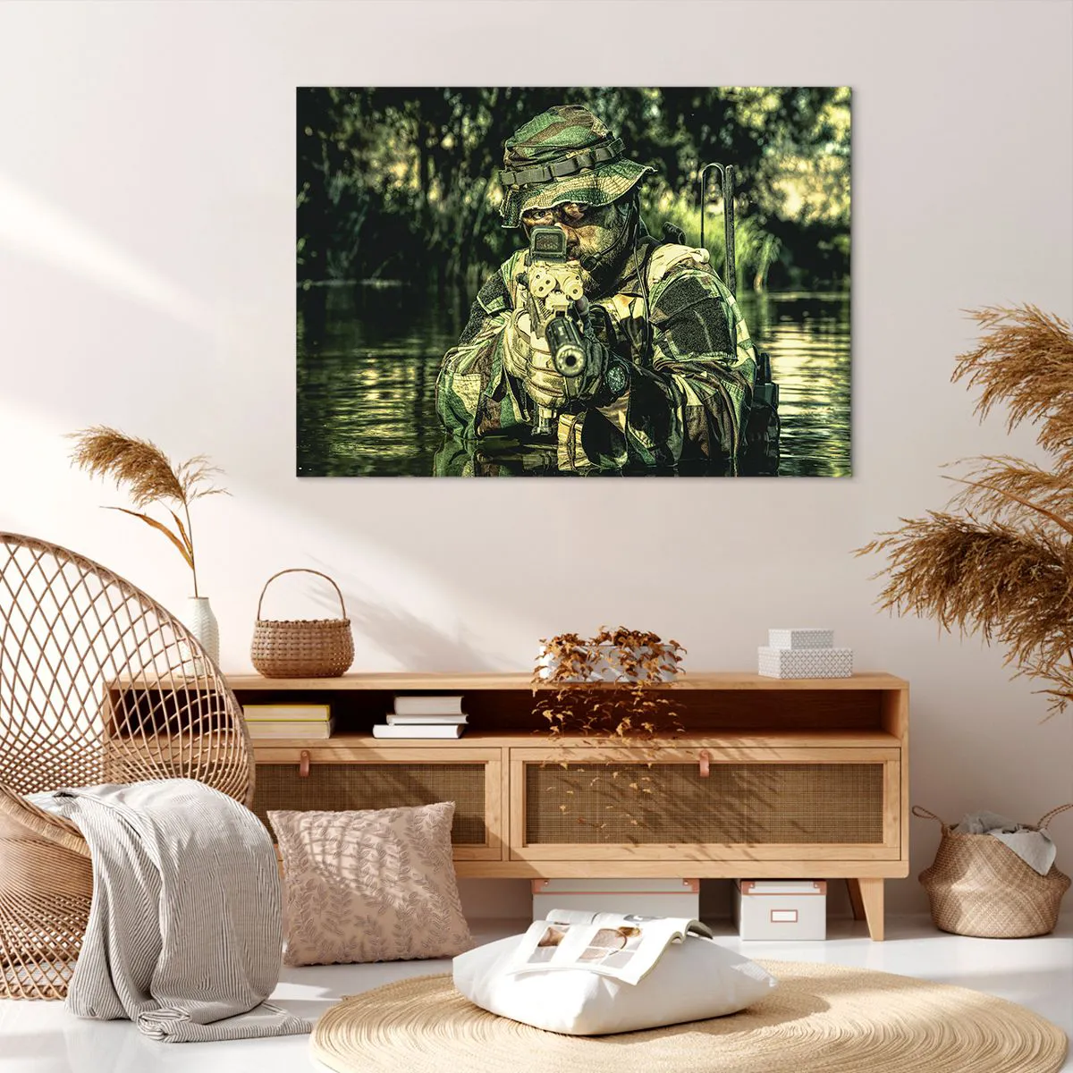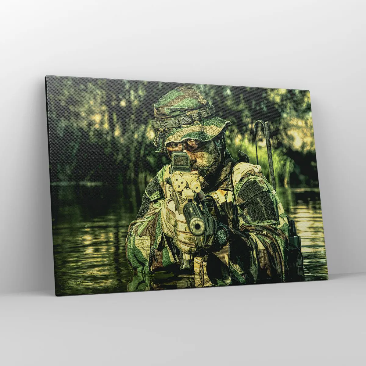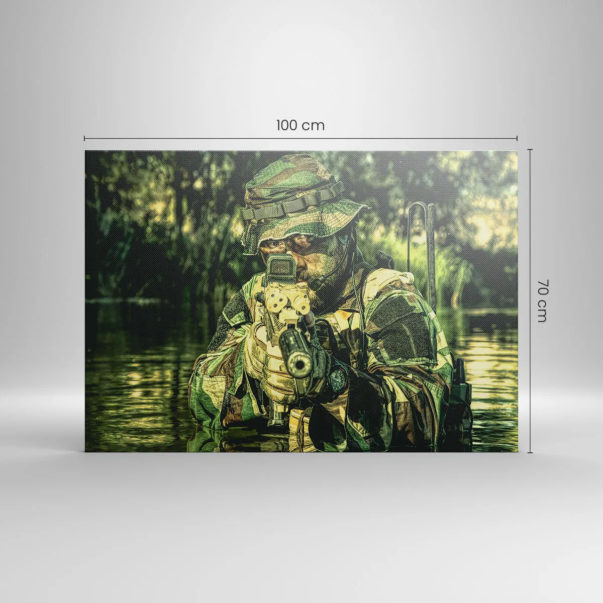 Bild auf Leinwand - Leinwandbild - Ein Soldat in Tarnkleidung zielt durch das Wasser. - 100x70cm - Das Beste vom Besten - Moderne Wanddekoration für Wohnzimmer und Schlafzimmer ARTTOR