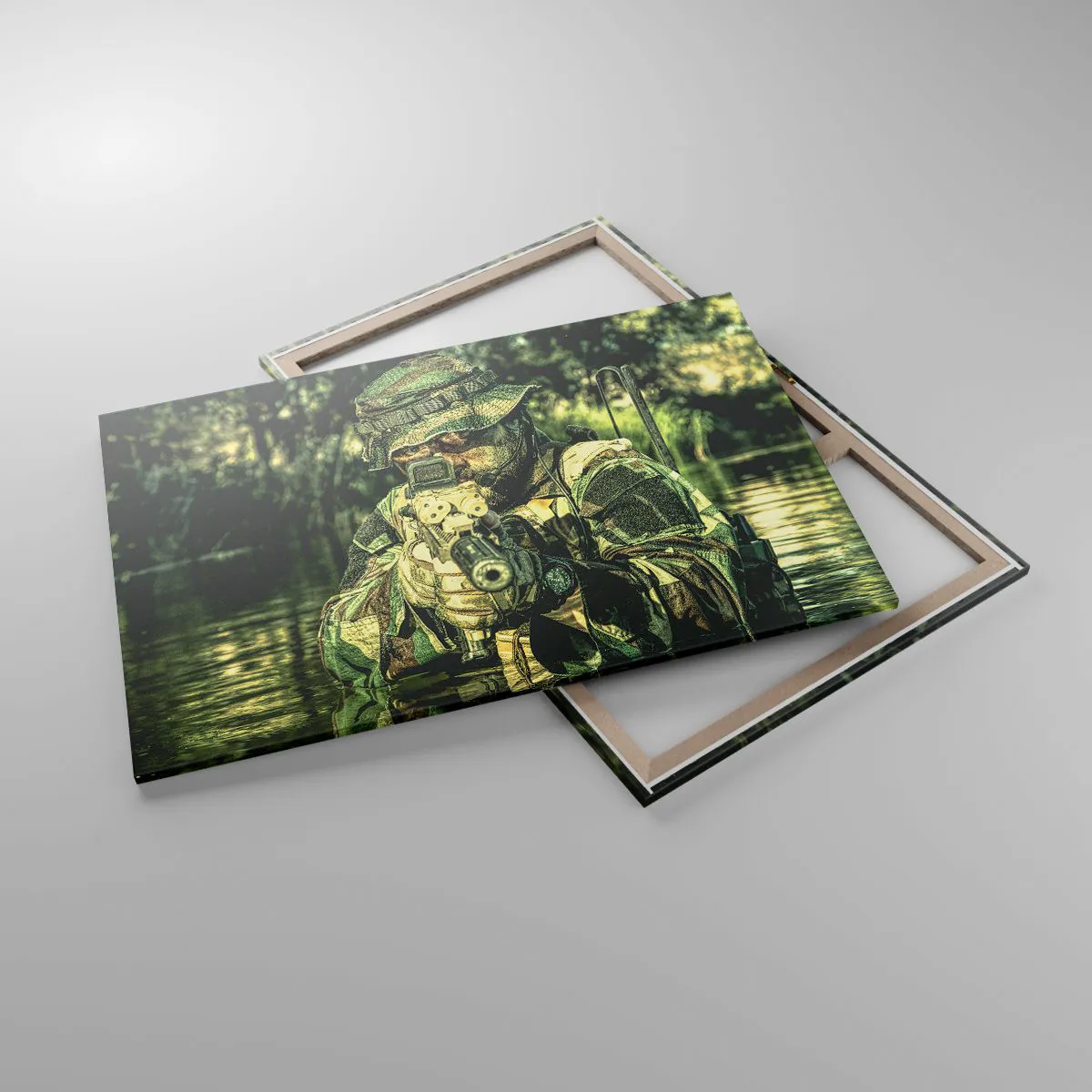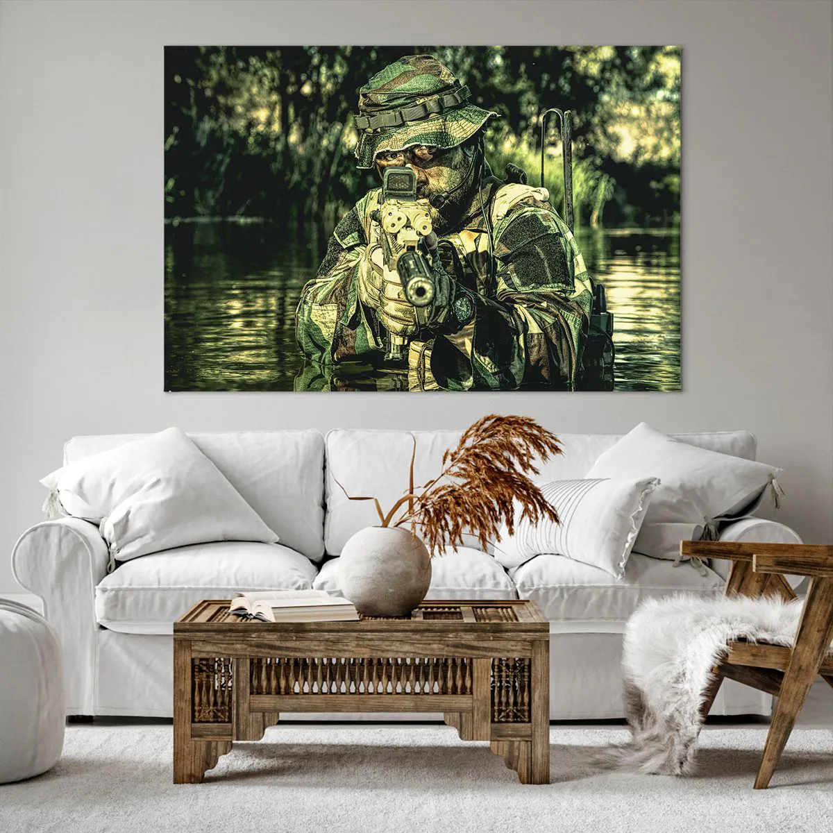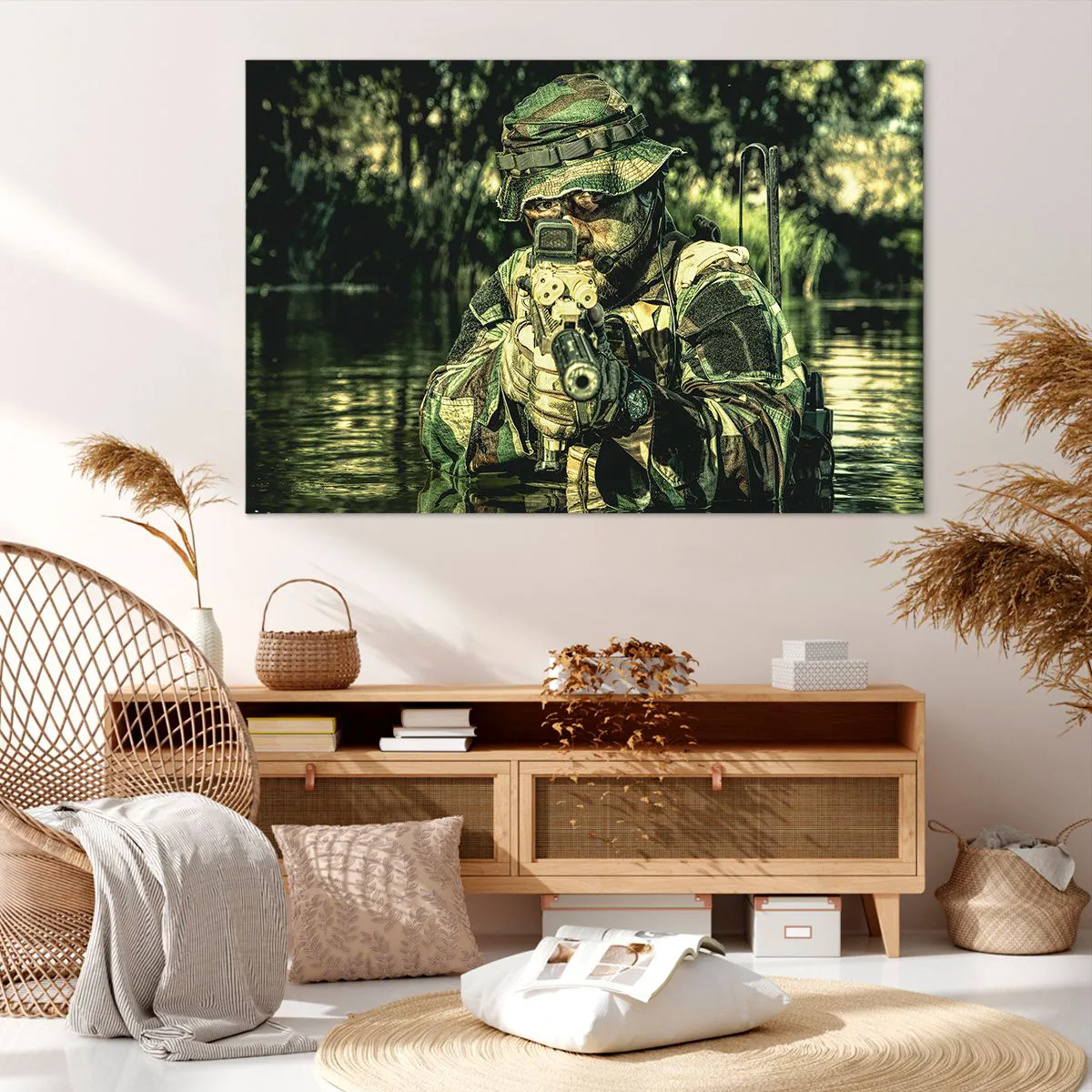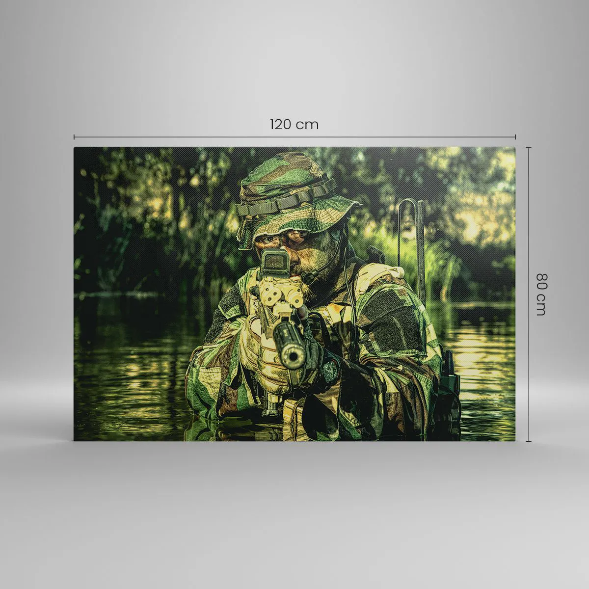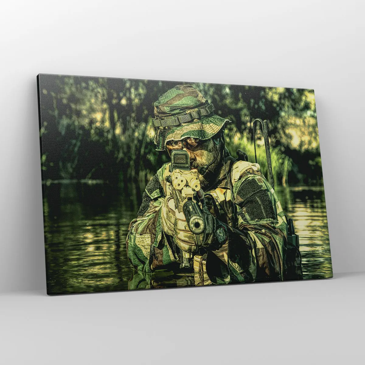 Bild auf Leinwand - Leinwandbild - Ein Soldat in Tarnkleidung zielt durch das Wasser. - 120x80cm - Das Beste vom Besten - Moderne Wanddekoration für Wohnzimmer und Schlafzimmer ARTTOR