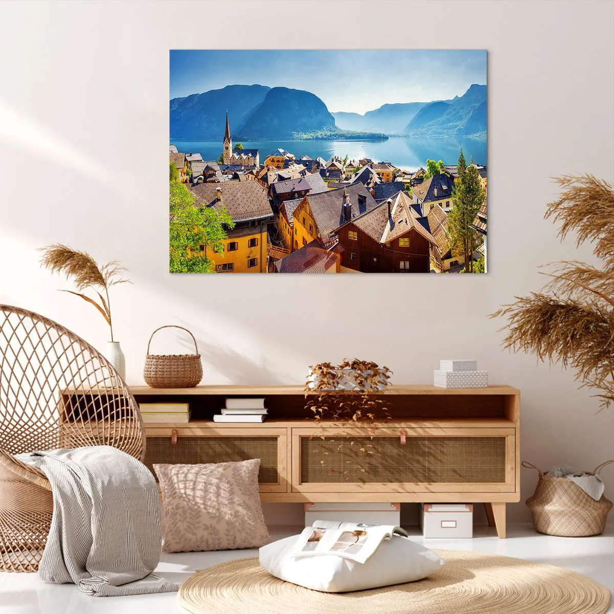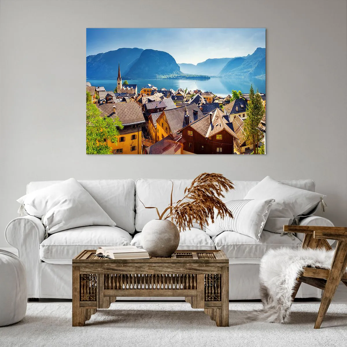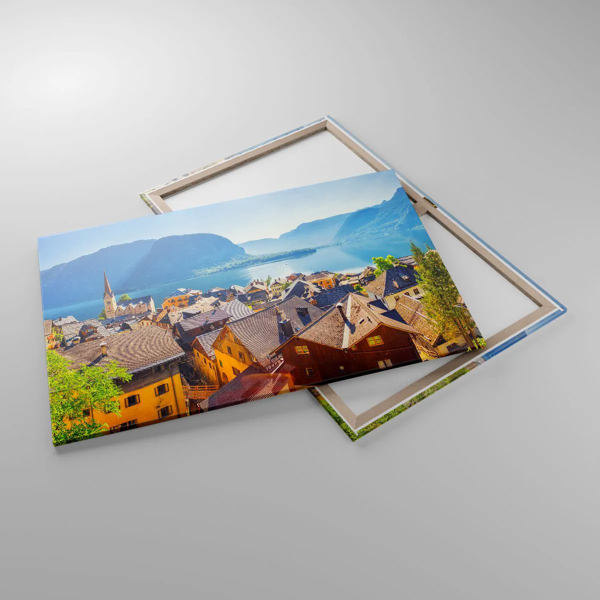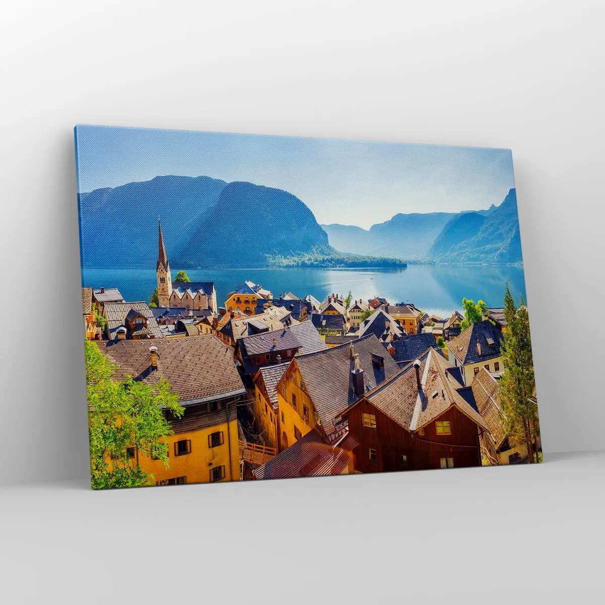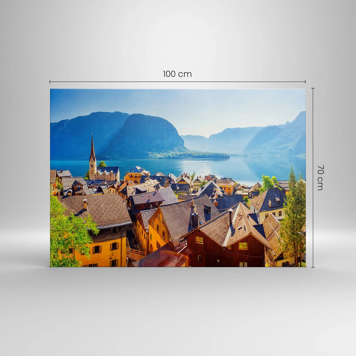 Bild auf Leinwand - Leinwandbild - Ein malerisches Dorf an einem See, umgeben von Bergen an einem sonnigen Tag - 100x70cm - Es könnte nicht malerischer sein - Moderne Wanddekoration für Wohnzimmer und Schlafzimmer ARTTOR