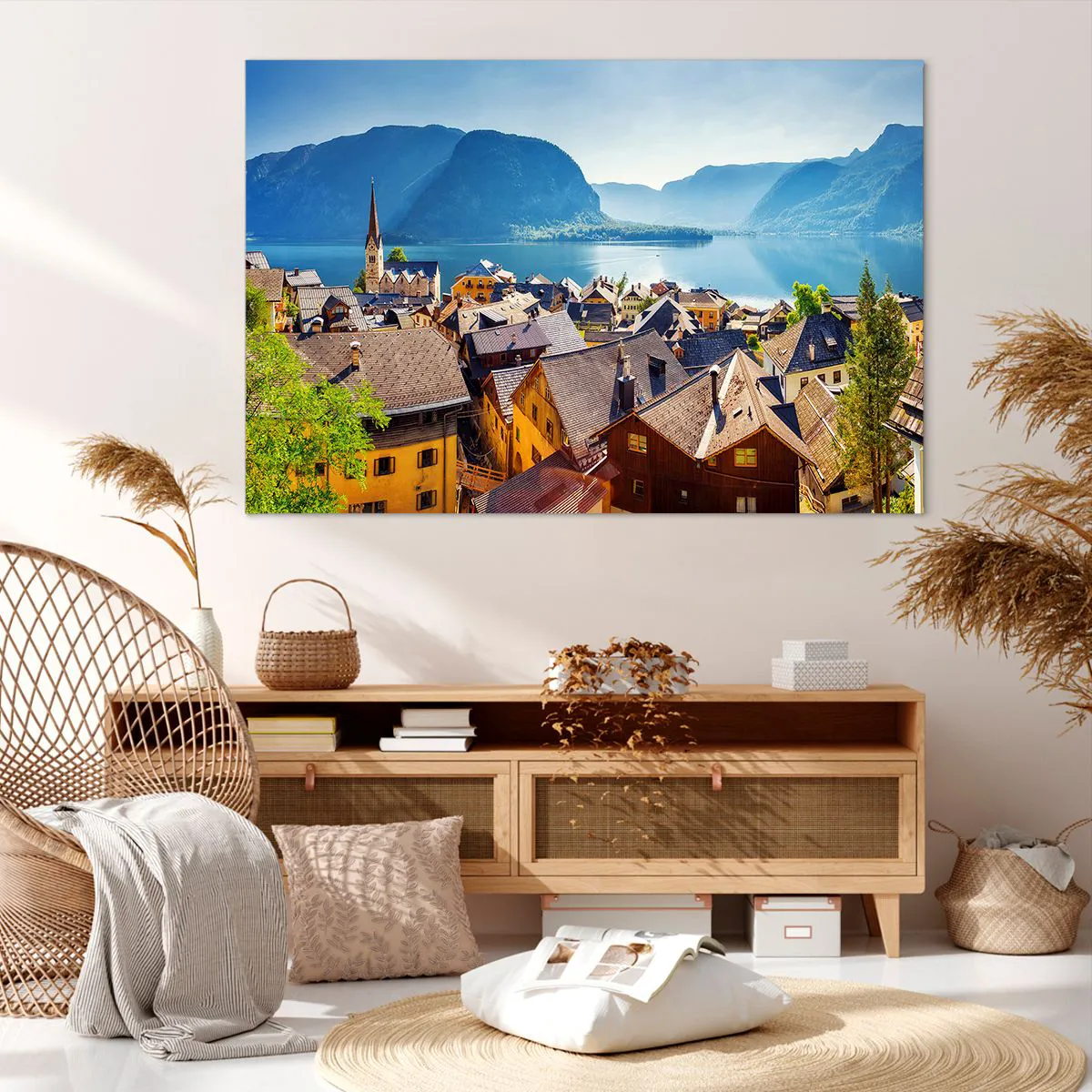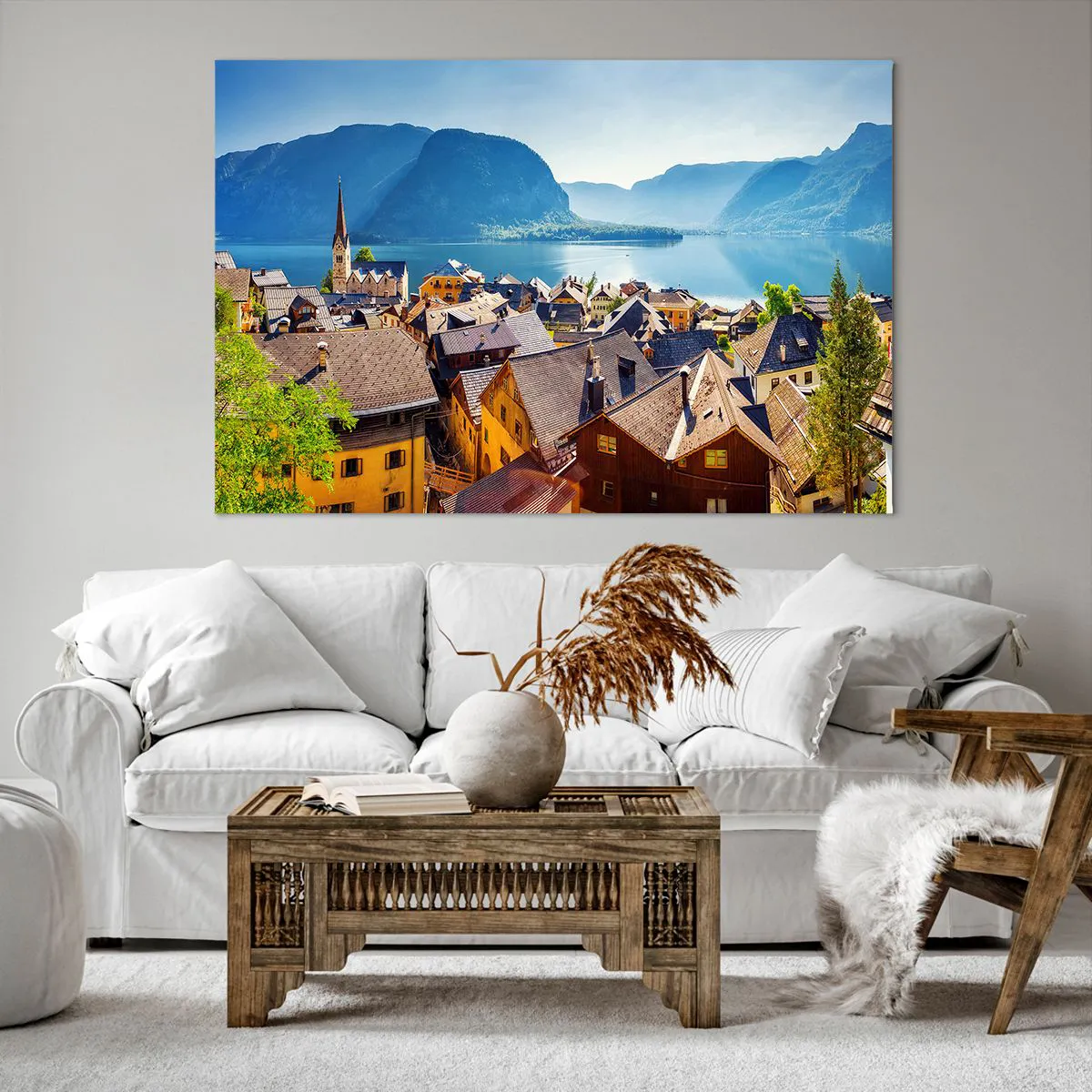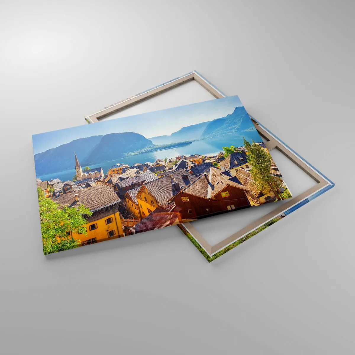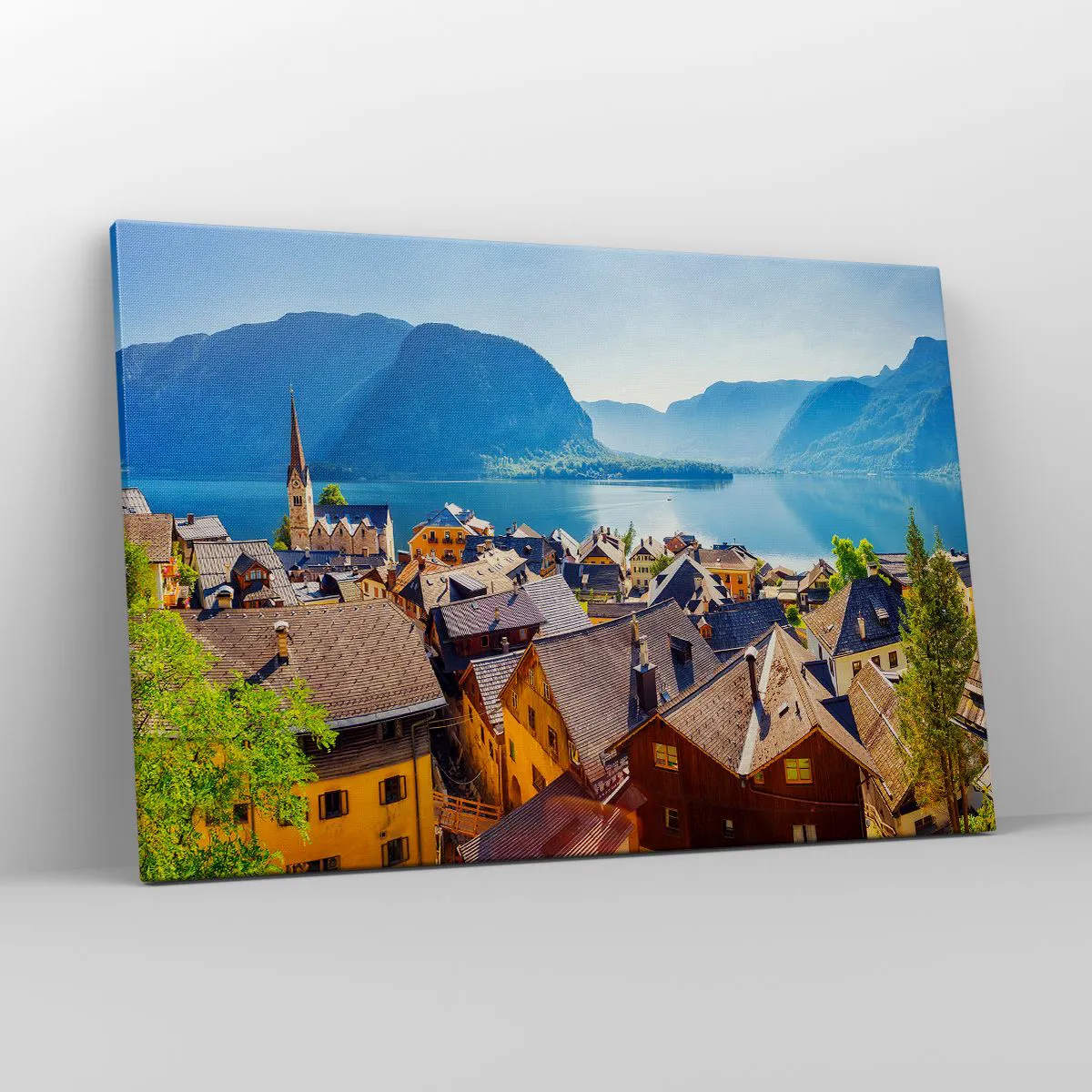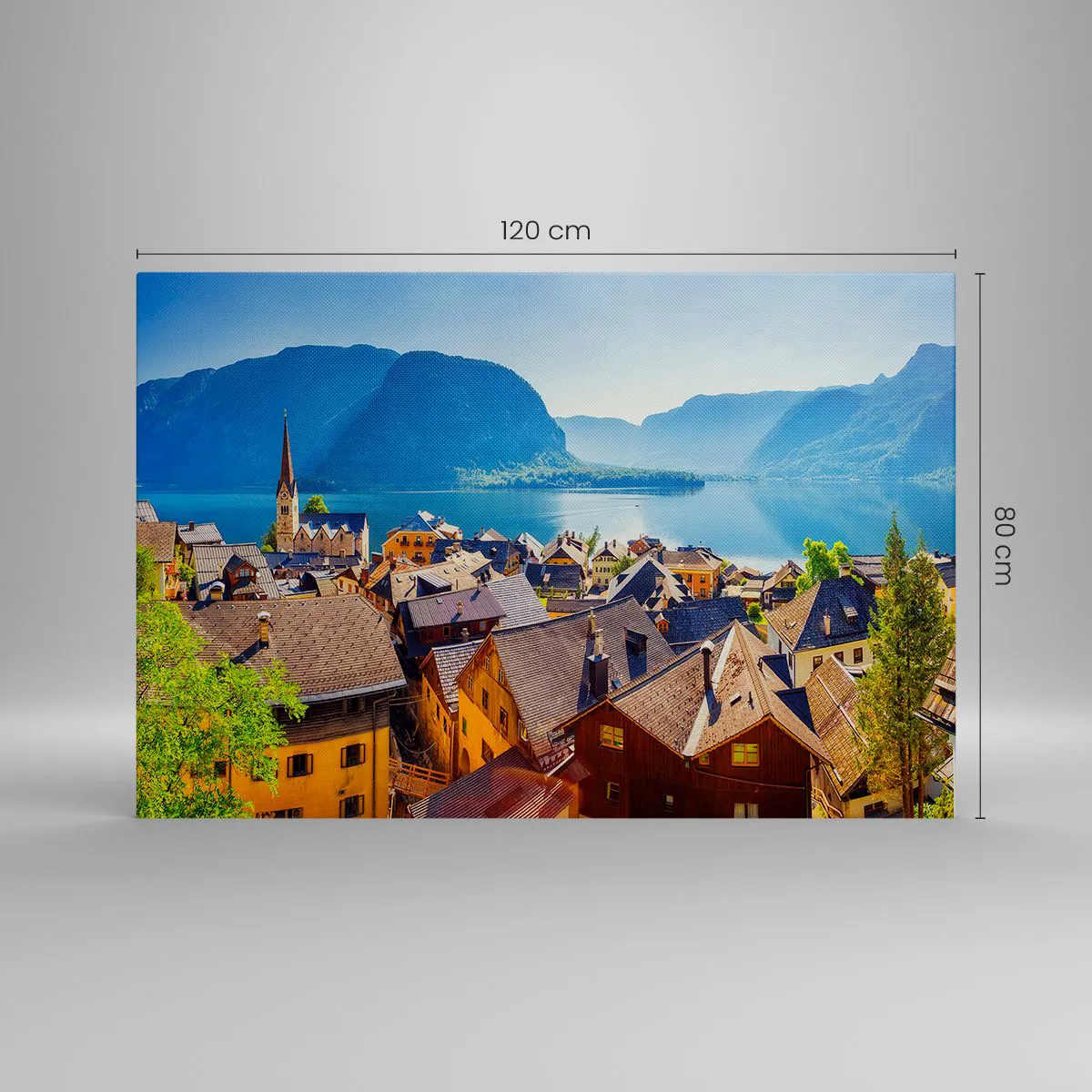 Bild auf Leinwand - Leinwandbild - Ein malerisches Dorf an einem See, umgeben von Bergen an einem sonnigen Tag - 120x80cm - Es könnte nicht malerischer sein - Moderne Wanddekoration für Wohnzimmer und Schlafzimmer ARTTOR