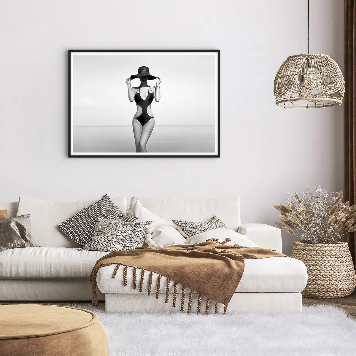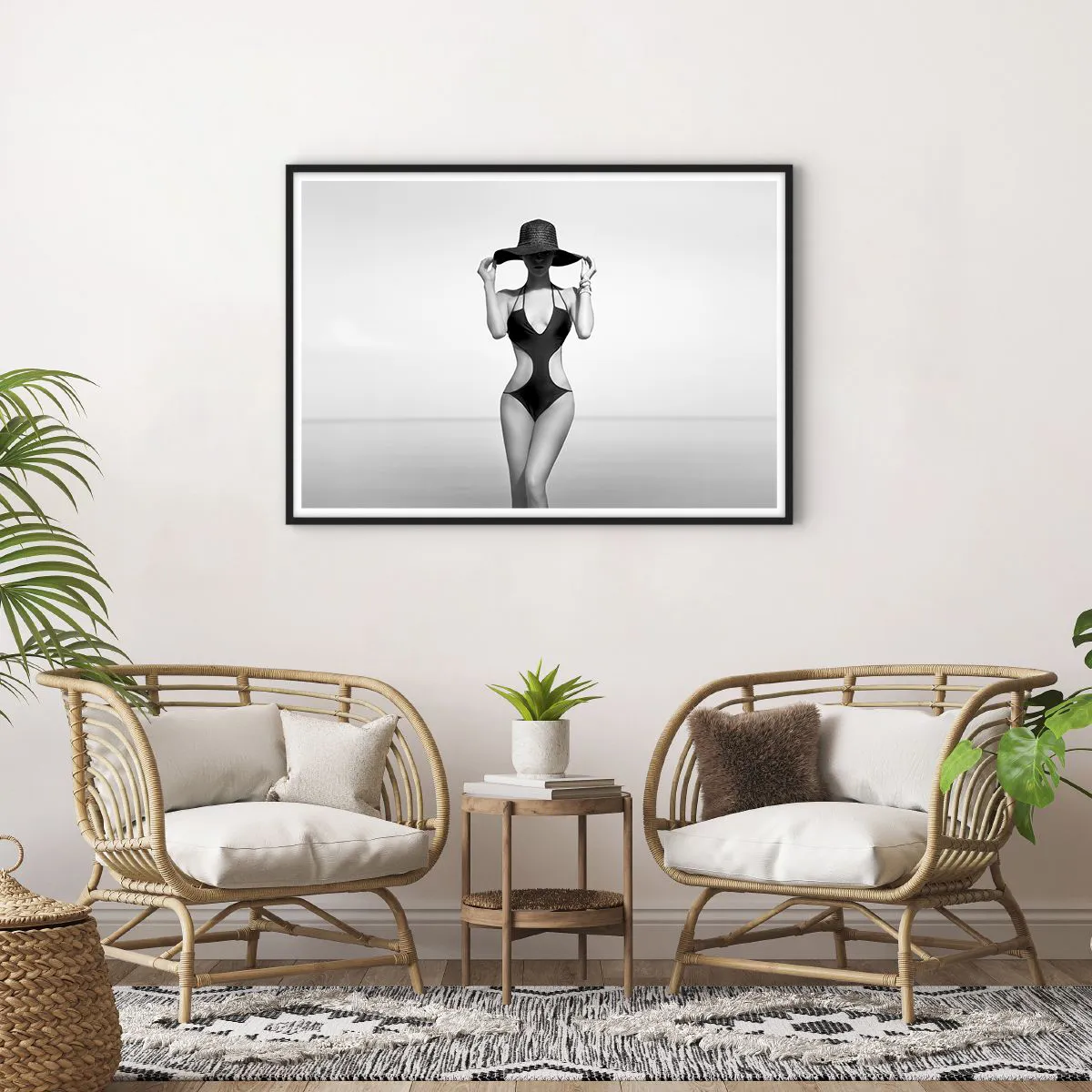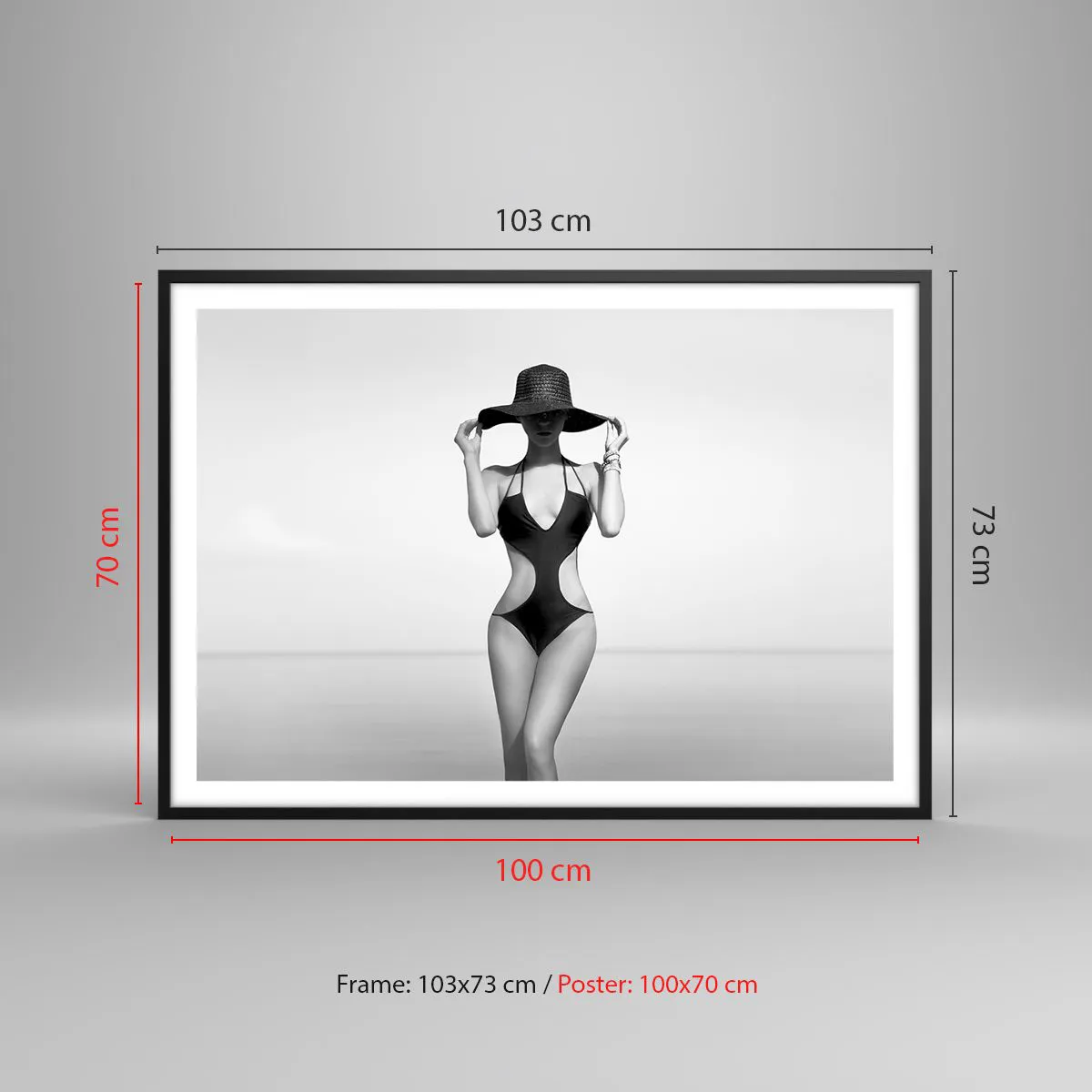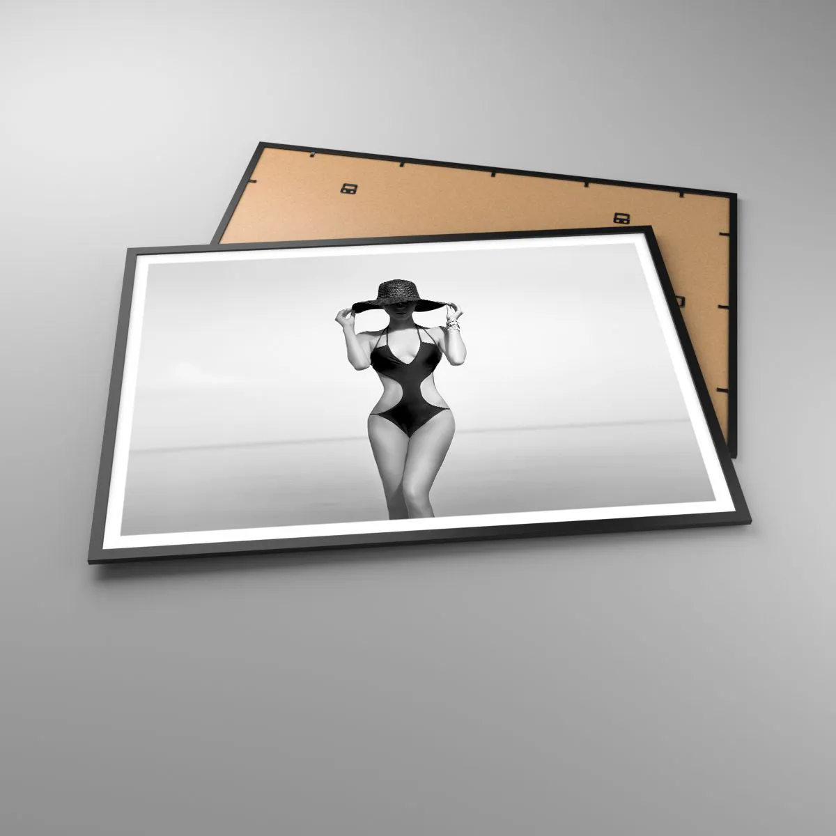 Poster in einem schwarzem Rahmen - Schwarz-weiße Silhouette einer Frau mit Hut vor dem Meereshintergrund - 100x70cm - Mein Name ist: Eleganz - Moderne Wanddekoration für Wohnzimmer und Schlafzimmer ARTTOR