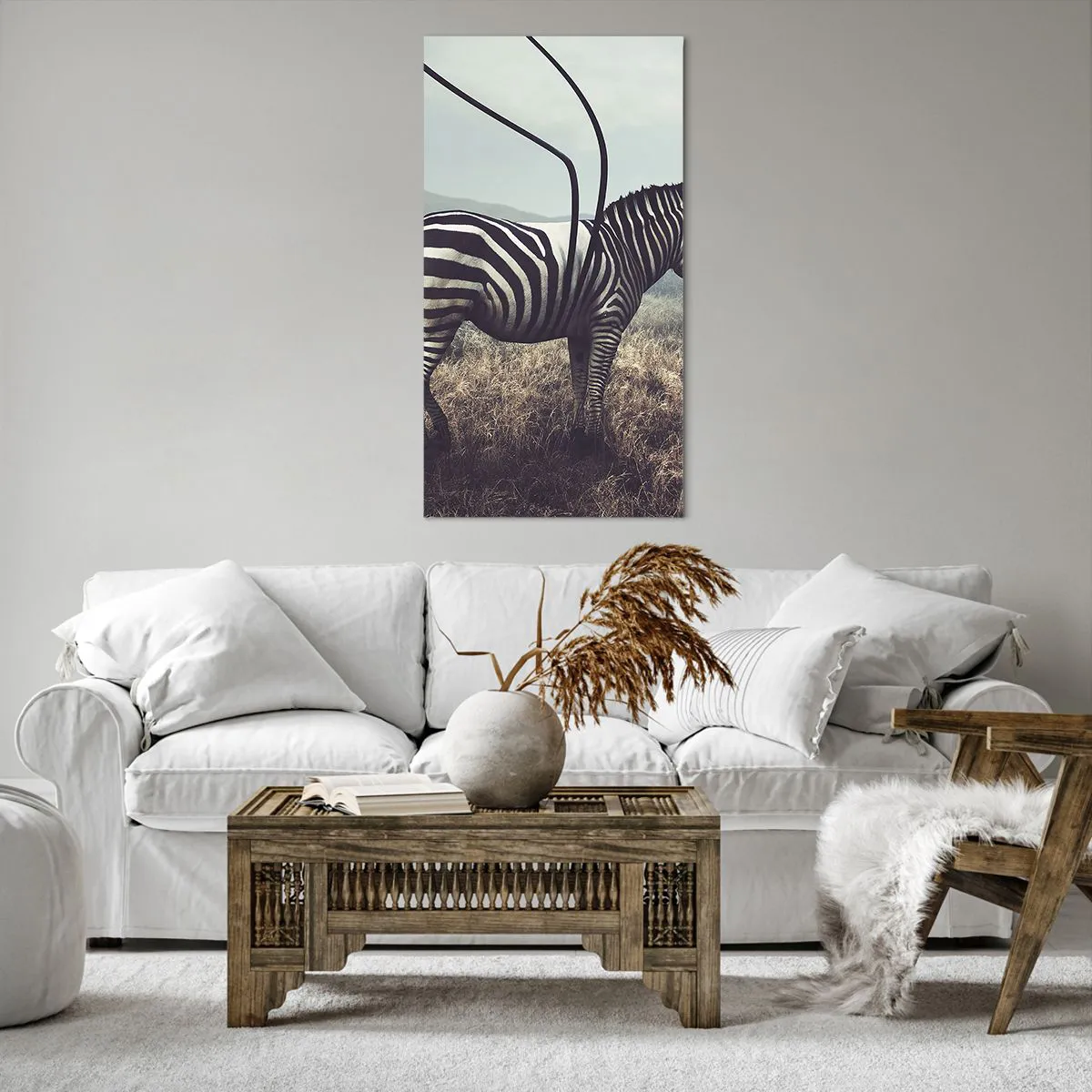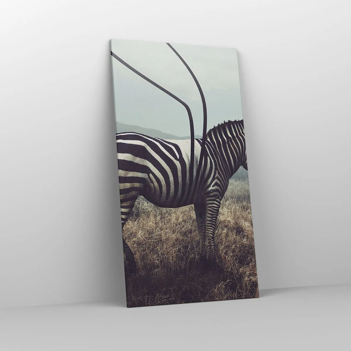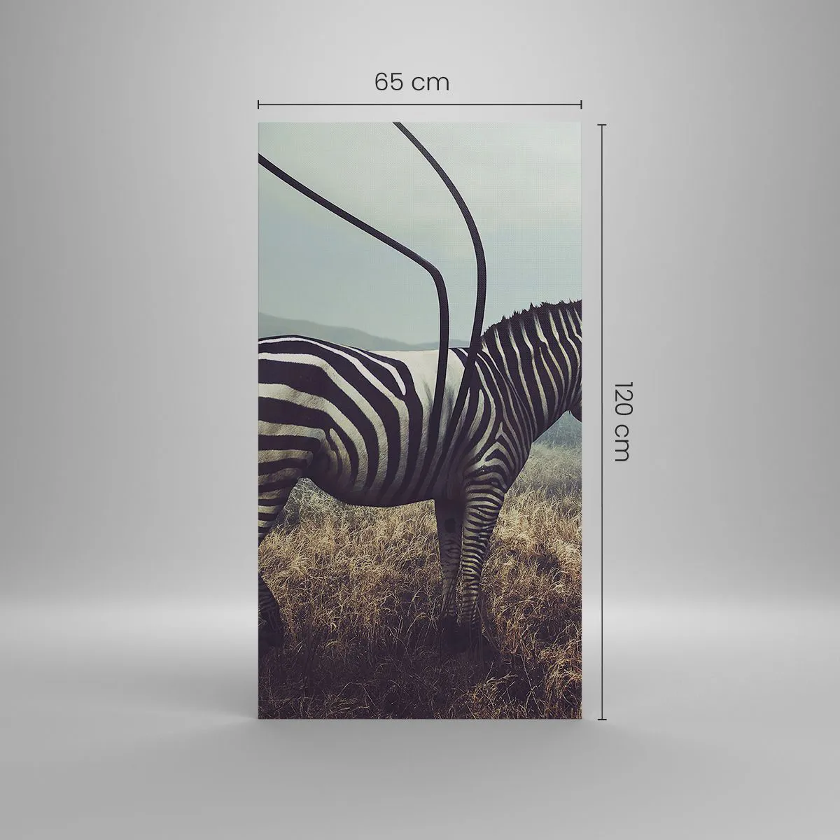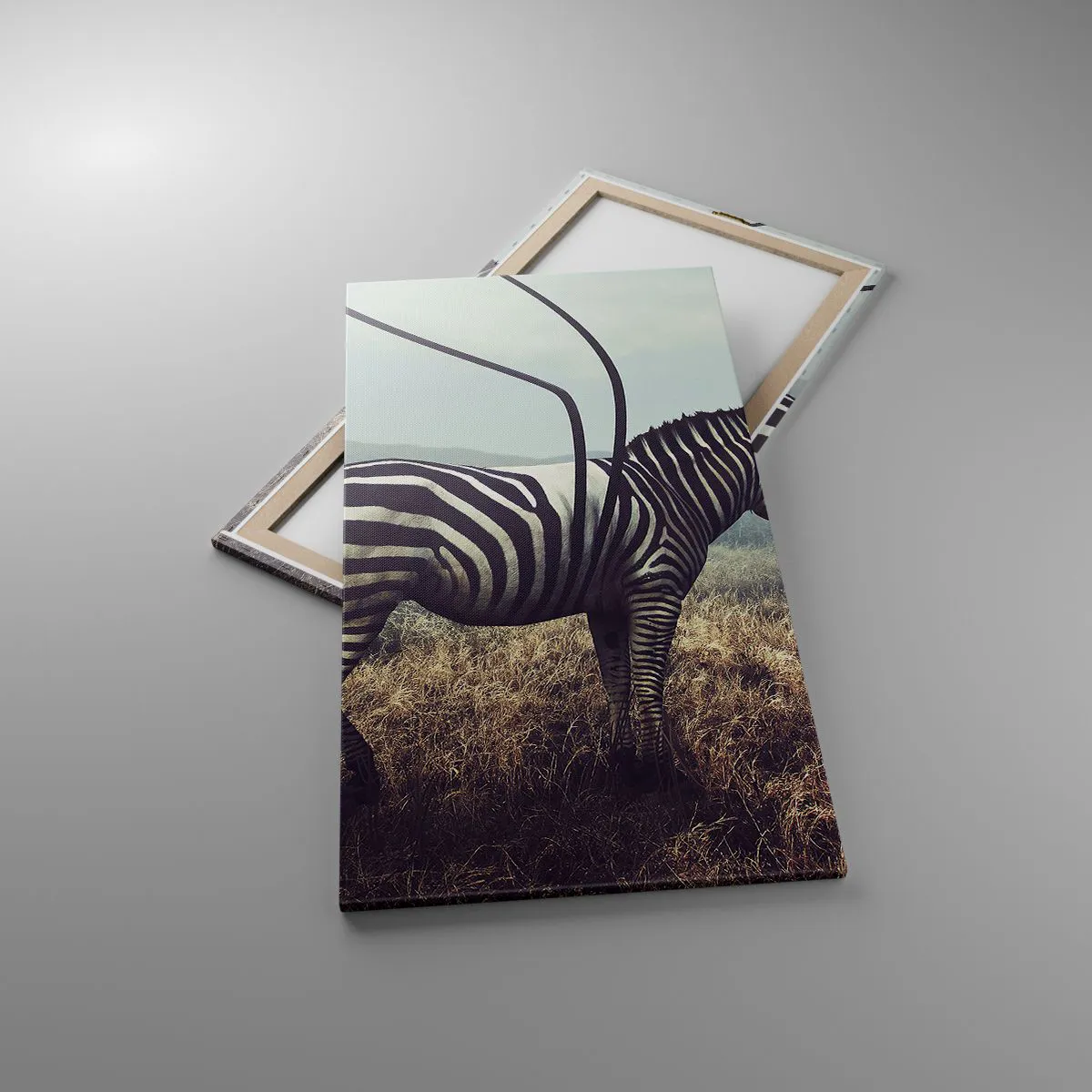 Die Leinwand wird über den Rahmen gespannt. Die Seiten und Kanten werden gedruckt, um das Bild fortzusetzen. Das Bild ist fertig zum Aufhängen an der Wand. Jedes Produkt hat einen am Rahmen befestigten Anhänger und ein Montageset (Schraube + Stift).