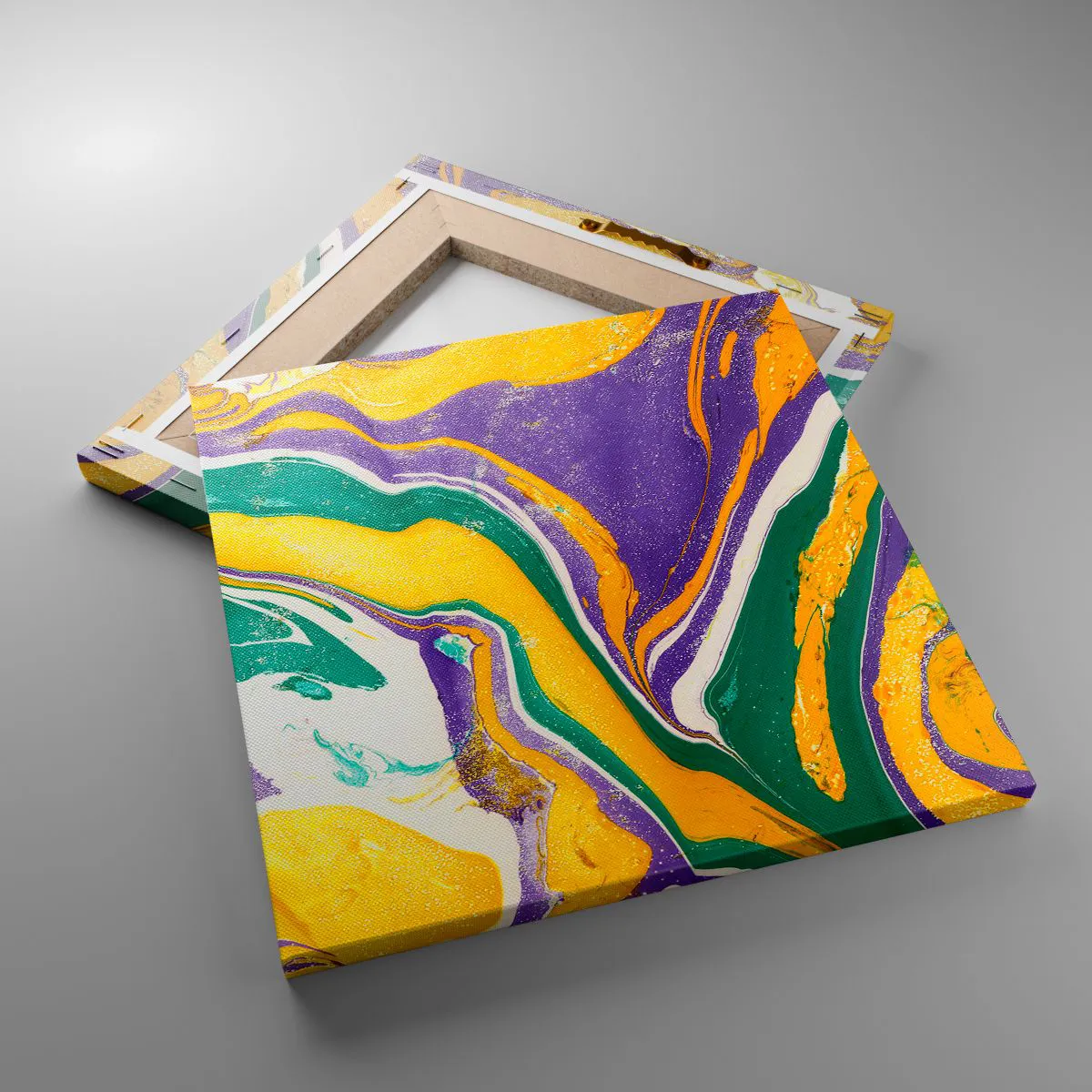 Die Leinwand wird über den Rahmen gespannt. Die Seiten und Kanten werden gedruckt, um das Bild fortzusetzen. Das Bild ist fertig zum Aufhängen an der Wand. Jedes Produkt hat einen am Rahmen befestigten Anhänger und ein Montageset (Schraube + Stift).