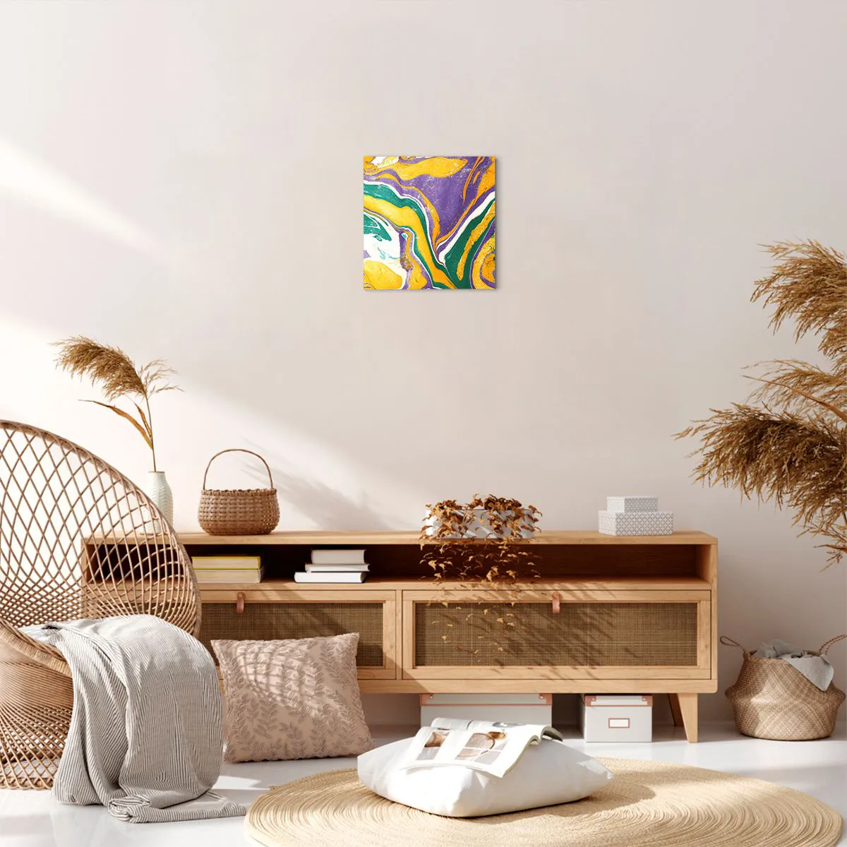 Wir verwenden ökologische, geruchslose und langlebige Tinten mit tiefer Farbsättigung. Durch moderne Drucktechnik wird der Druck präzise platziert, wobei die sichtbare Struktur der Leinwand erhalten bleibt