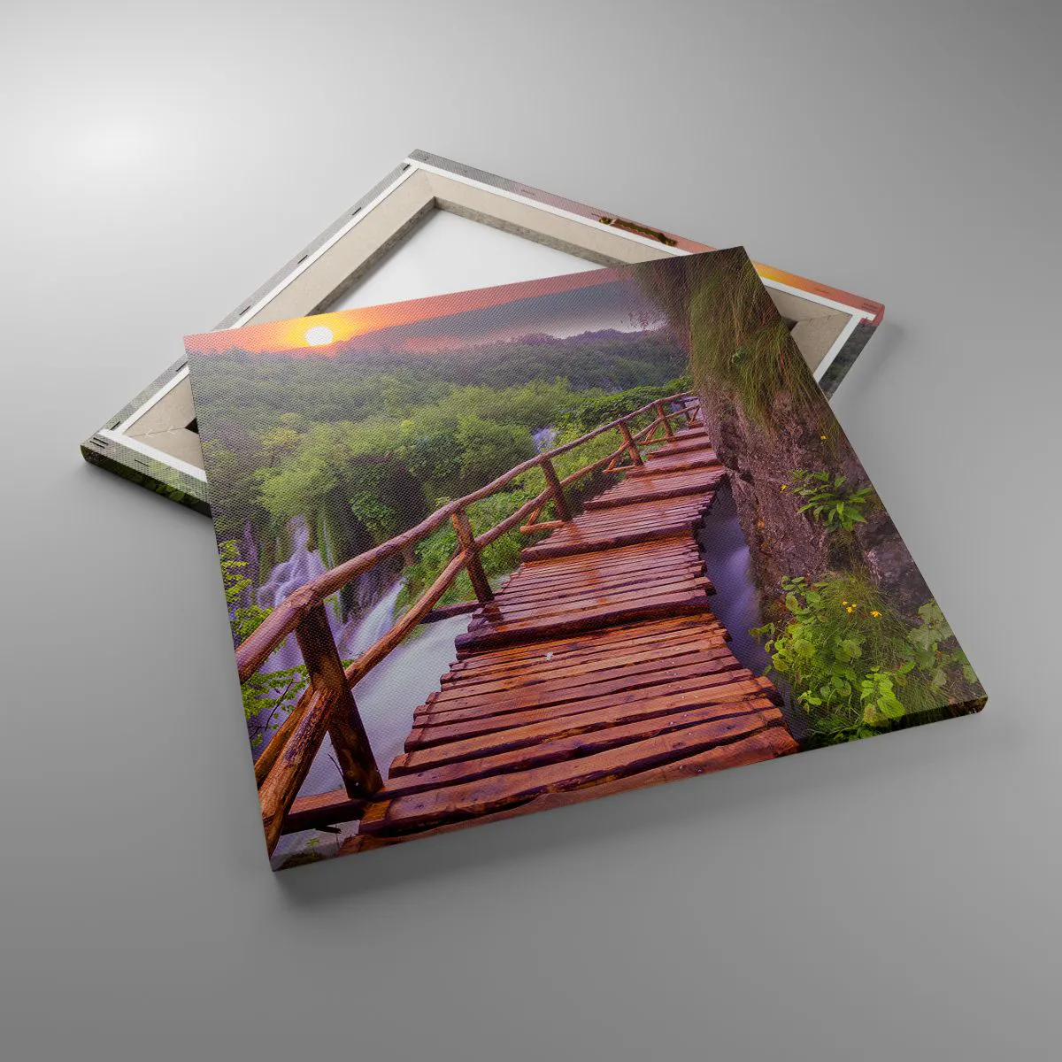 Die Leinwand wird über den Rahmen gespannt. Die Seiten und Kanten werden gedruckt, um das Bild fortzusetzen. Das Bild ist fertig zum Aufhängen an der Wand. Jedes Produkt hat einen am Rahmen befestigten Anhänger und ein Montageset (Schraube + Stift).