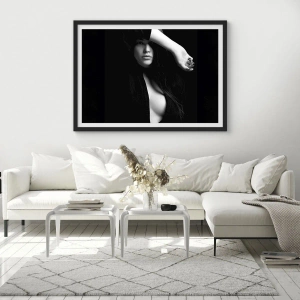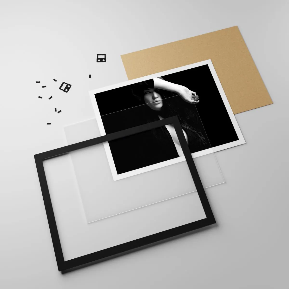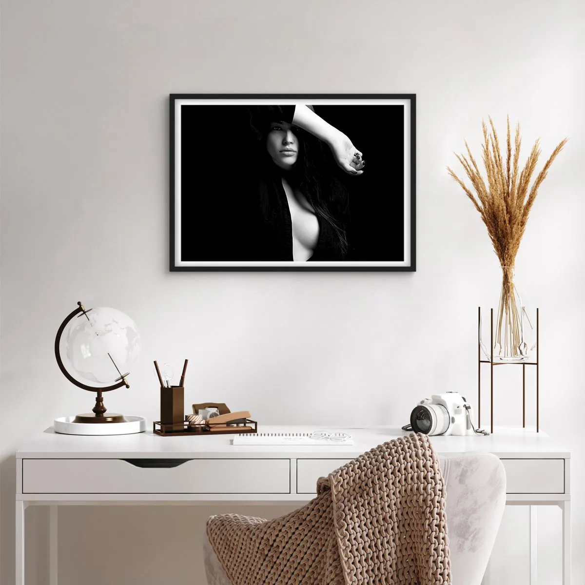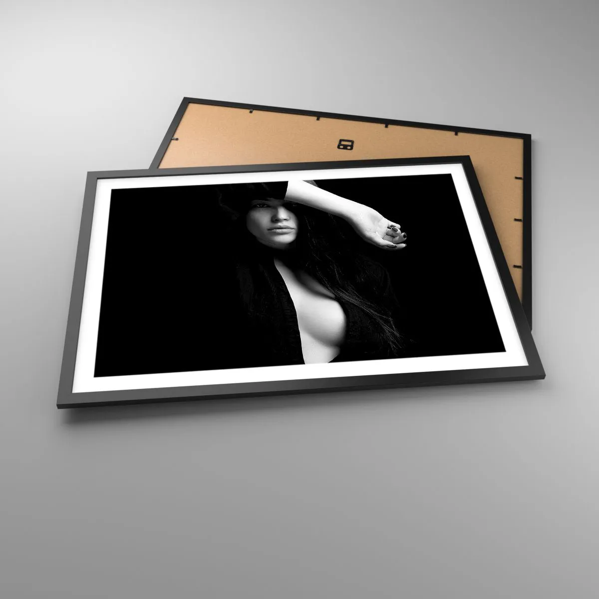 Poster in einem schwarzem Rahmen - Stilvolles Frauenporträt in Schwarz-Weiß - 70x50cm - Schule der Verführung - Moderne Wanddekoration für Wohnzimmer und Schlafzimmer ARTTOR