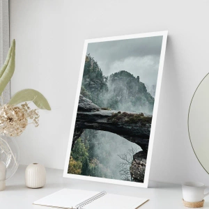 Poster - Ein Foto einer geheimnisvollen, in Nebel gehüllten Felsbrücke in einer Berglandschaft. - 50x70cm - Abenteuer beginnt gleich - Moderne Wanddekoration für Wohnzimmer und Schlafzimmer ARTTOR