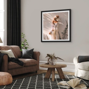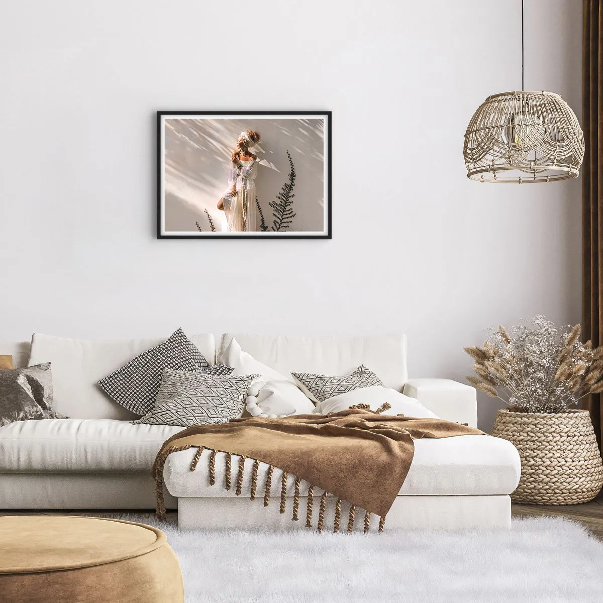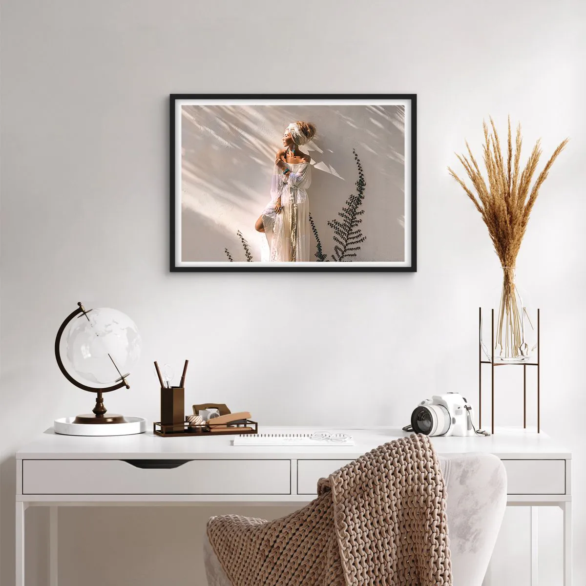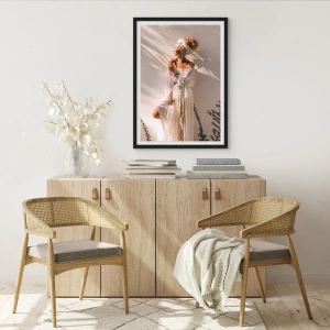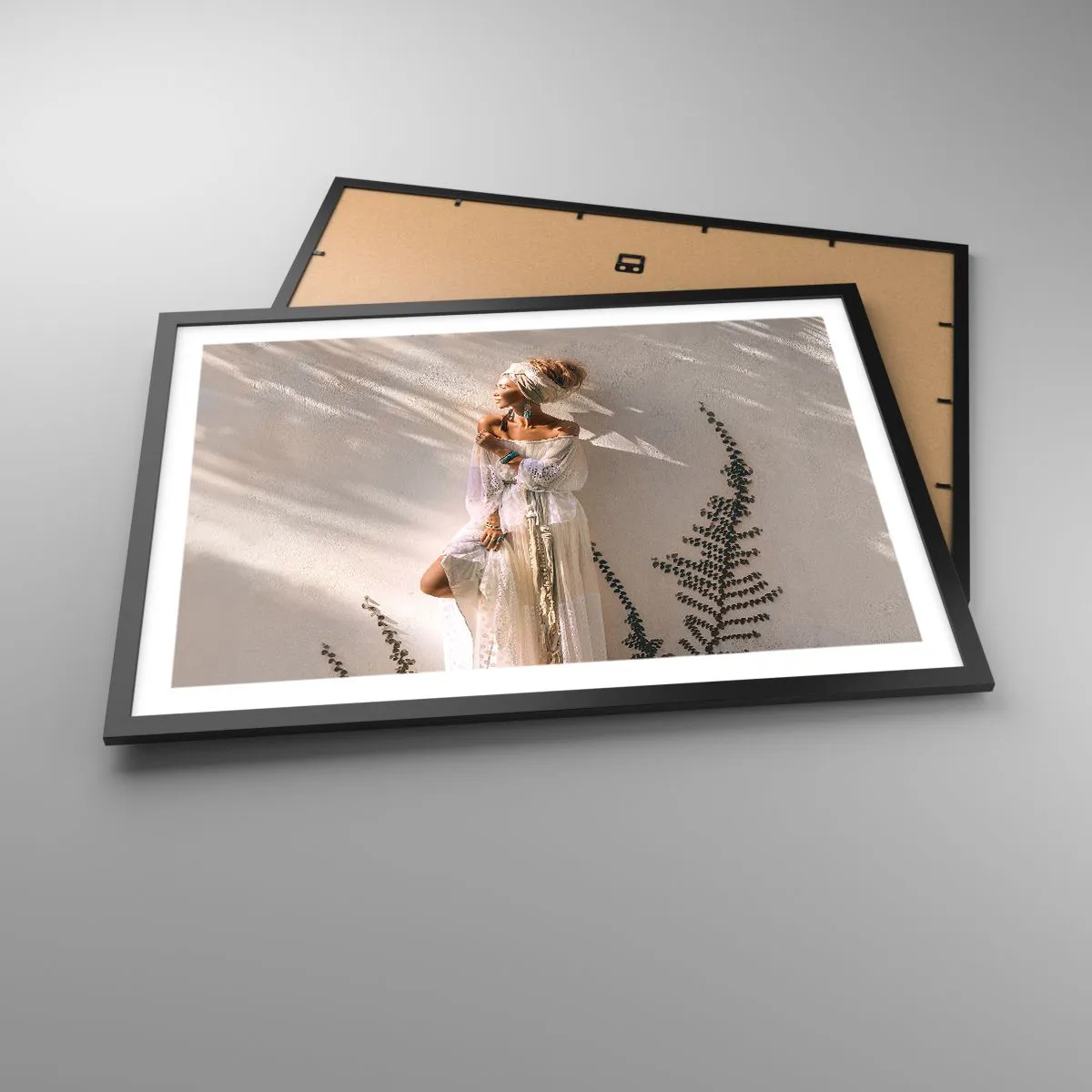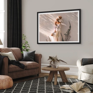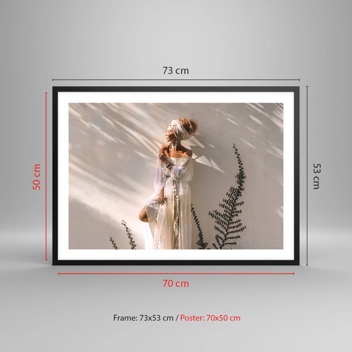Poster in einem schwarzem Rahmen - Eine Frau im Boho-Stil, beleuchtet von den Sonnenstrahlen - 70x50cm - Die Sonne und das Mädchen - Moderne Wanddekoration für Wohnzimmer und Schlafzimmer ARTTOR