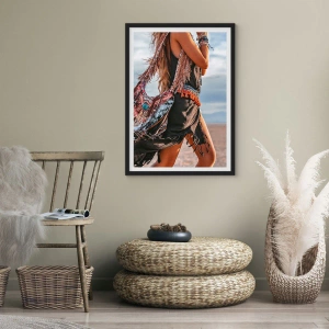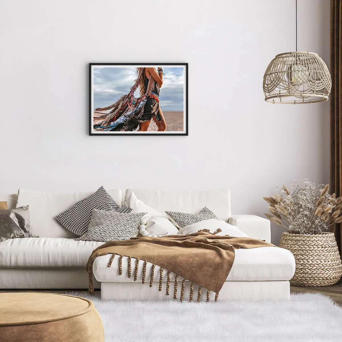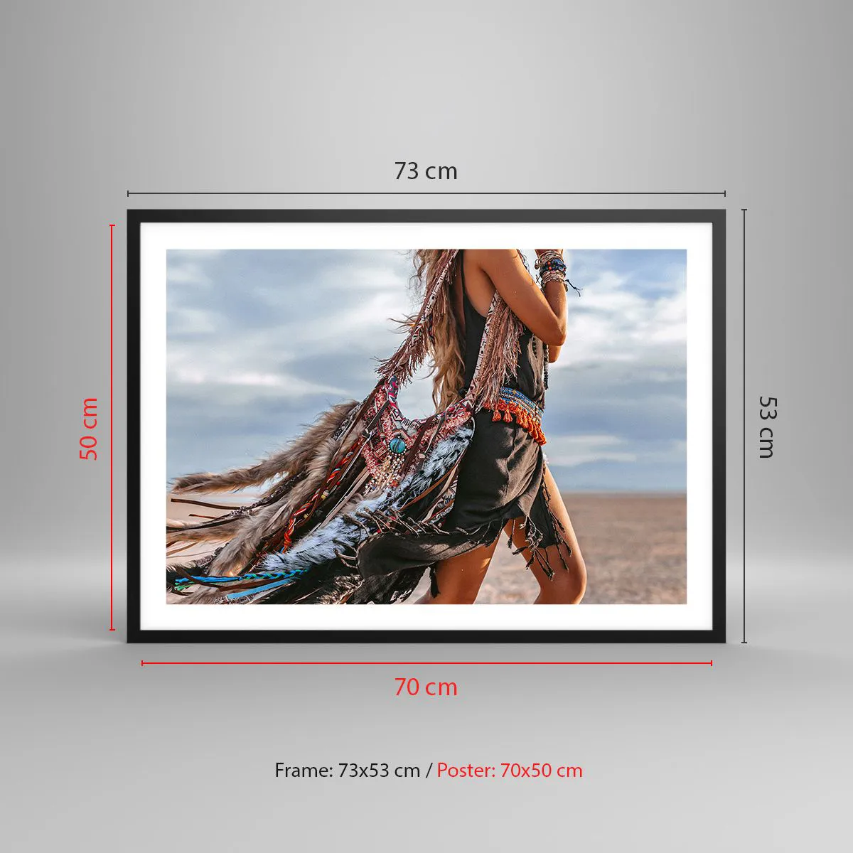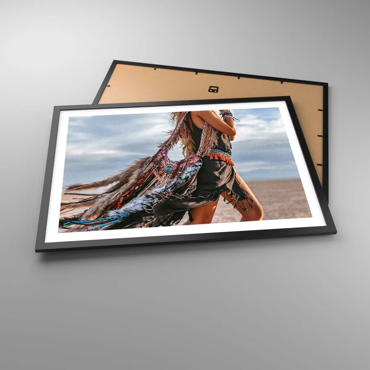 Poster in einem schwarzem Rahmen - Eine Frau im Boho-Stil mit Feder- und Schmuckdetails - 70x50cm - Das Mädchen des Schamanen - Moderne Wanddekoration für Wohnzimmer und Schlafzimmer ARTTOR