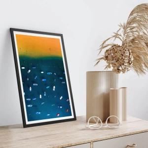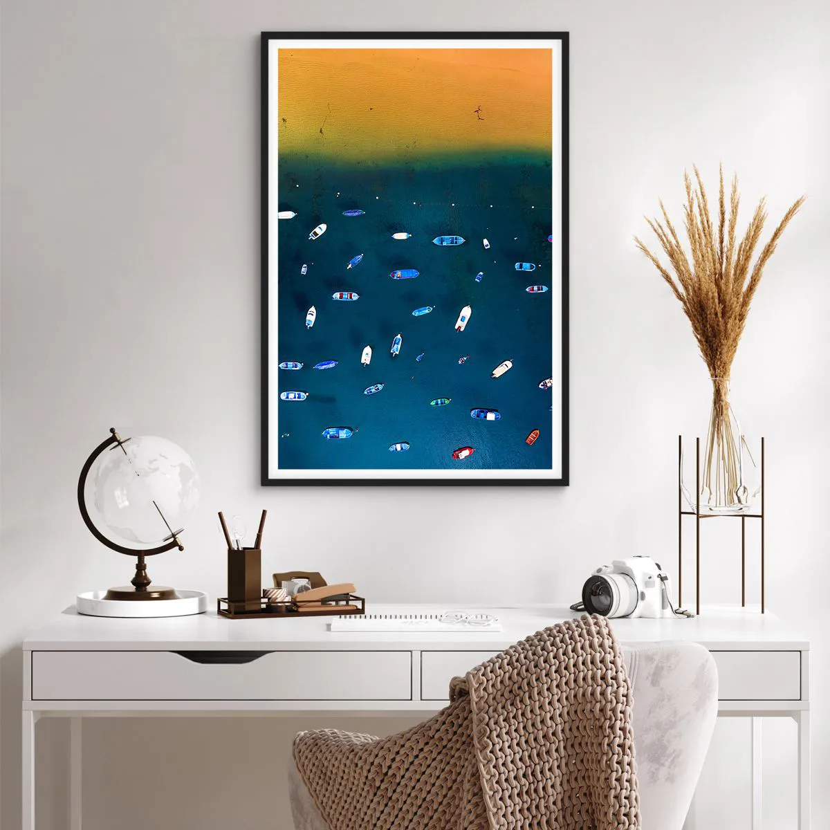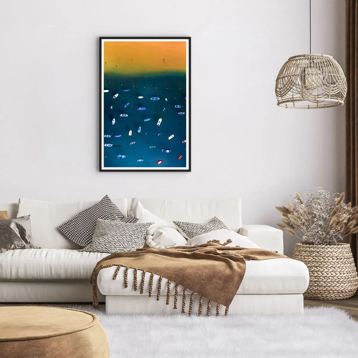• Boote, Strand, Küste, Landschaften, Maritim, Reisen, Für das Büro, für das Arbeitszimmer, für das Esszimmer, für das Badezimmer, für den Flur, für das Wohnzimmer, für das Schlafzimmer, Blau, Orange, Vertikal