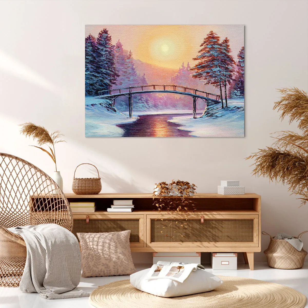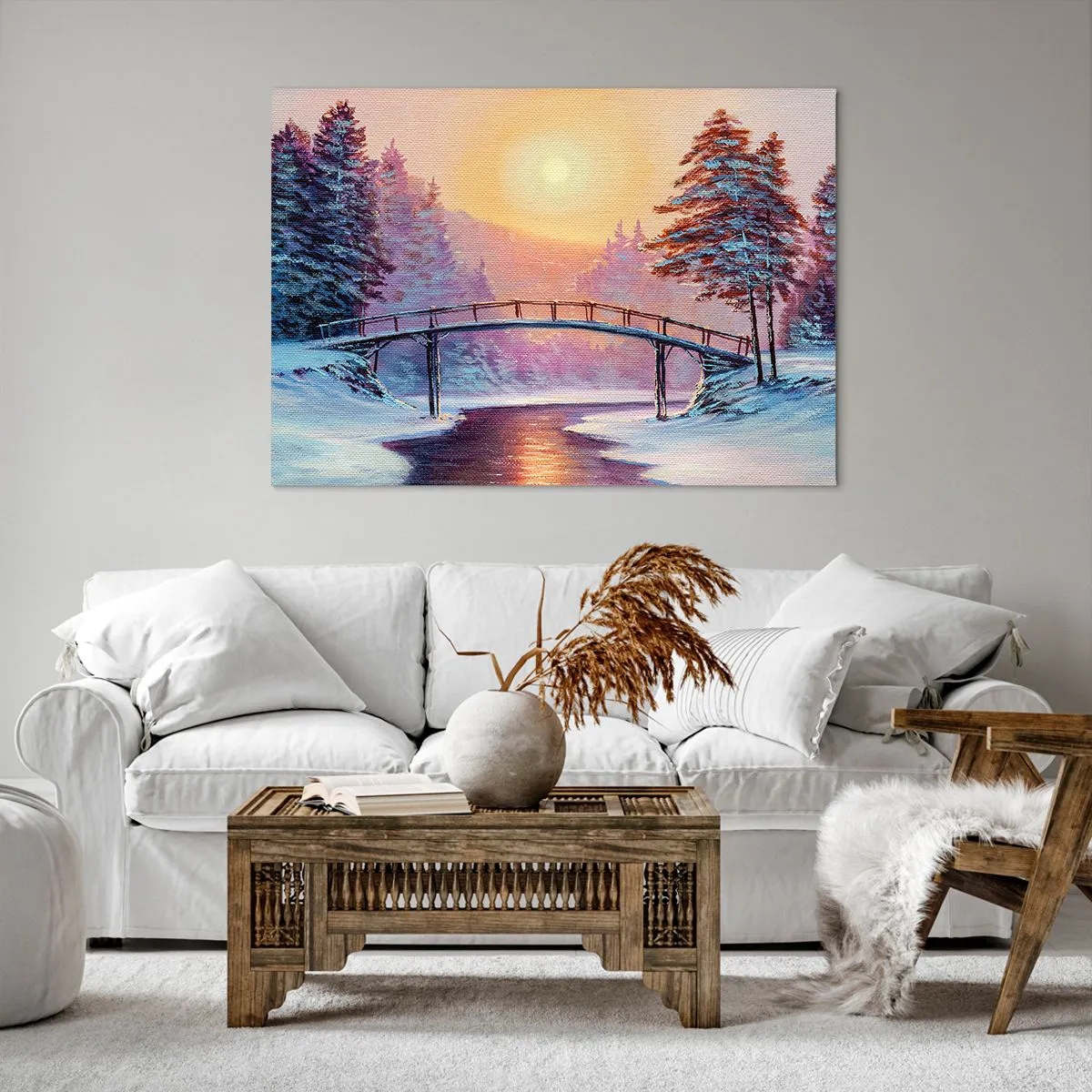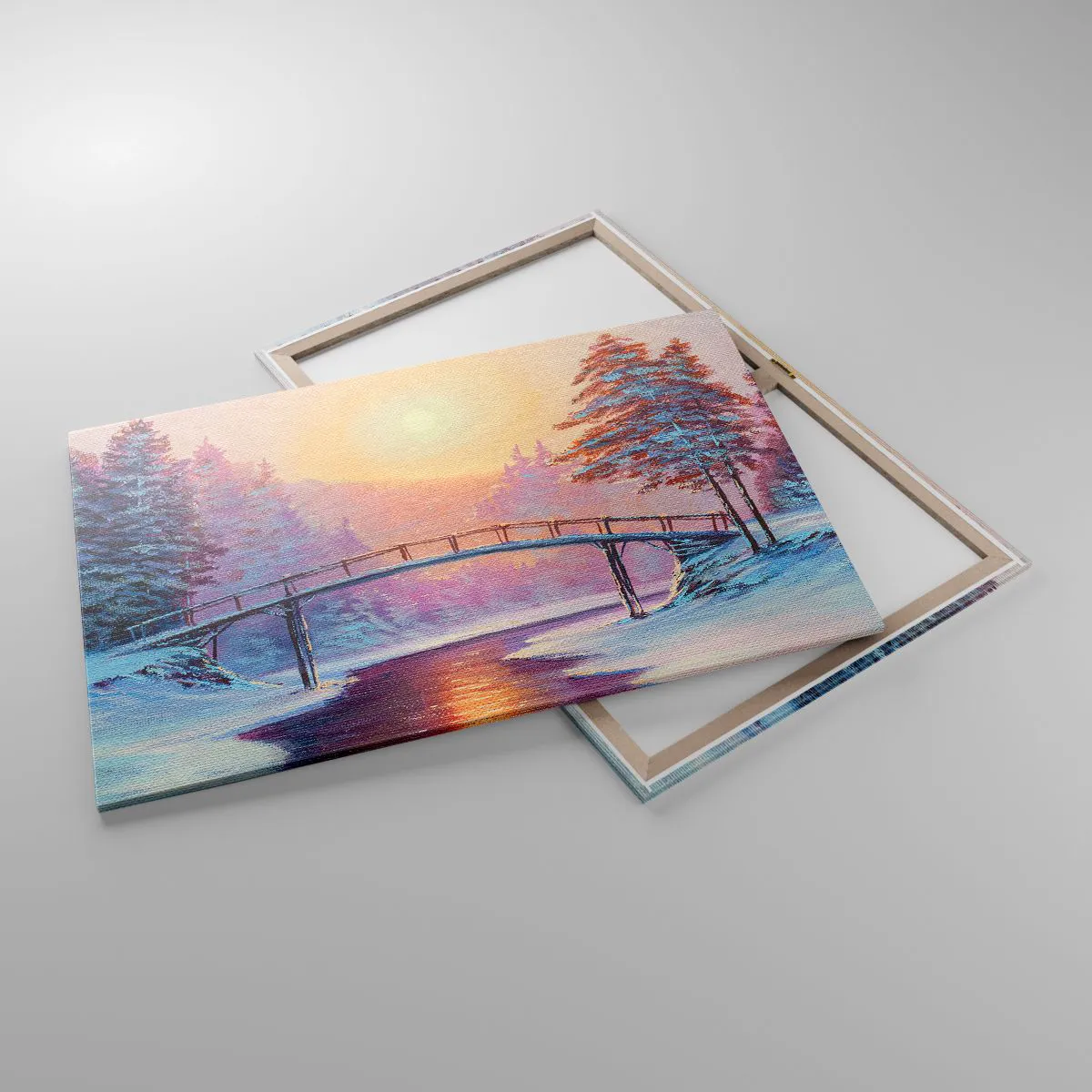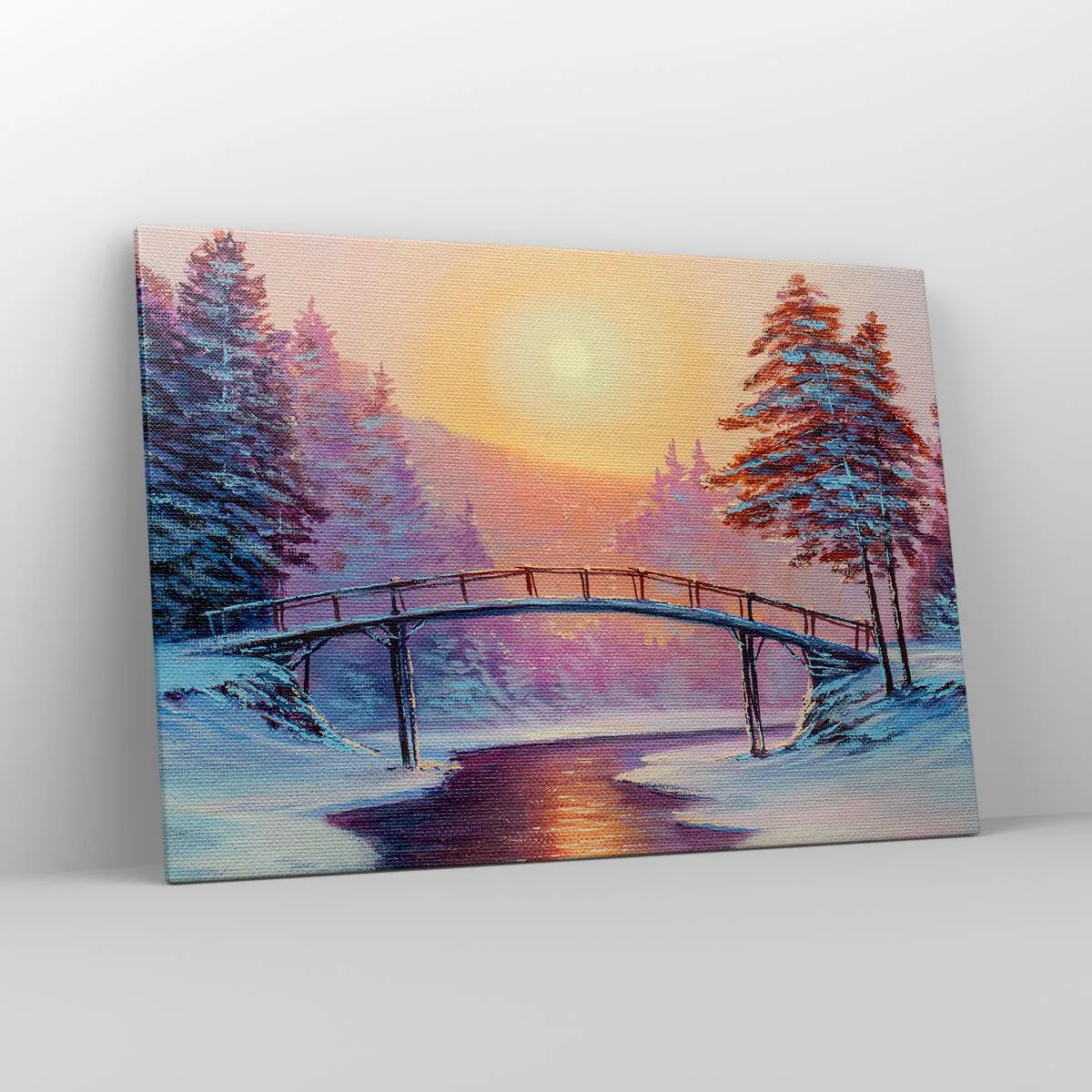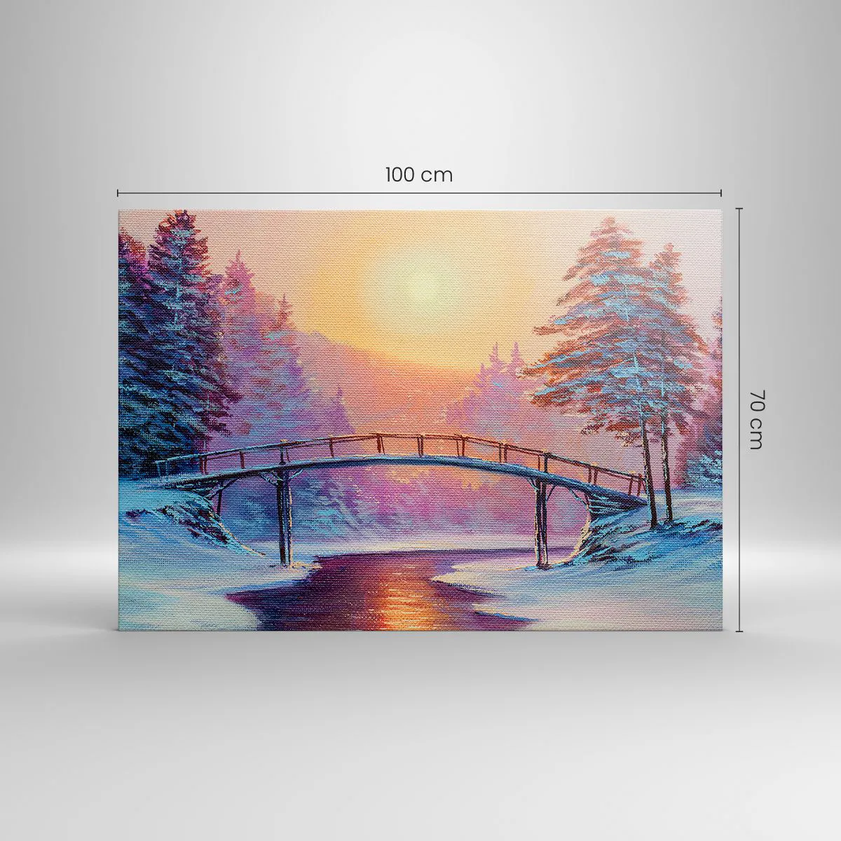 Bild auf Leinwand - Leinwandbild - Winterlandschaft mit einer vom Sonnenuntergang beleuchteten Brücke - 100x70cm - Vier Jahreszeiten - Winter - Moderne Wanddekoration für Wohnzimmer und Schlafzimmer ARTTOR