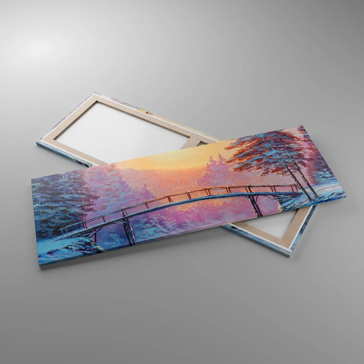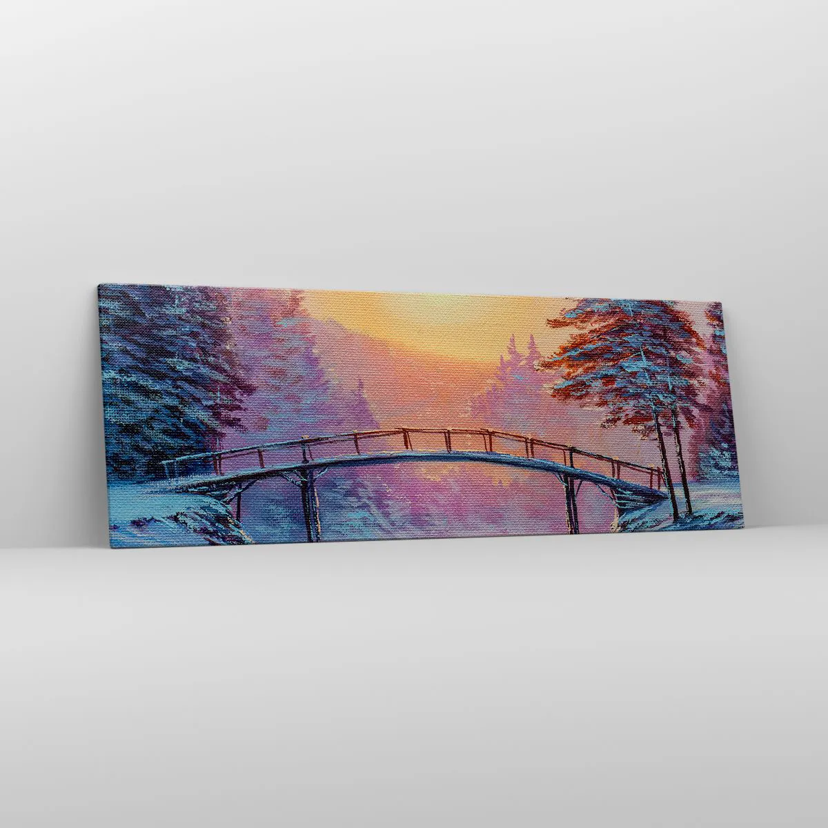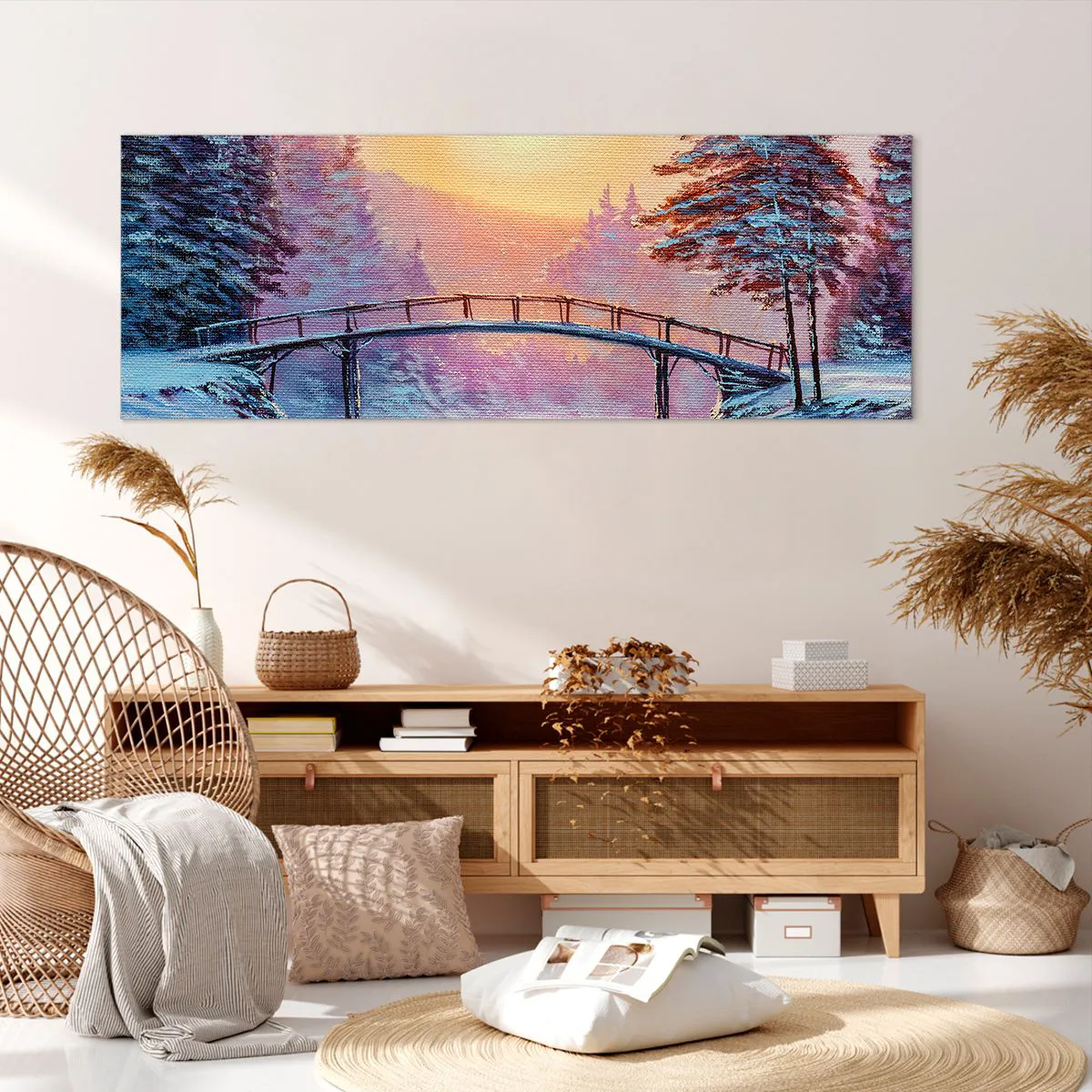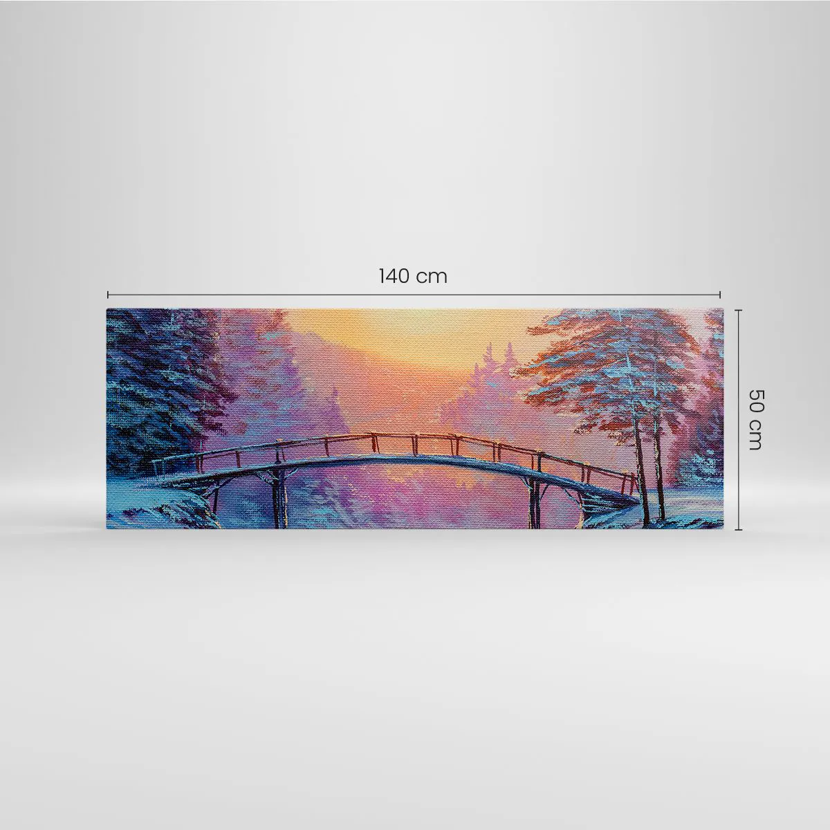 Bild auf Leinwand - Leinwandbild - Winterlandschaft mit einer vom Sonnenuntergang beleuchteten Brücke - 140x50cm - Vier Jahreszeiten - Winter - Moderne Wanddekoration für Wohnzimmer und Schlafzimmer ARTTOR
