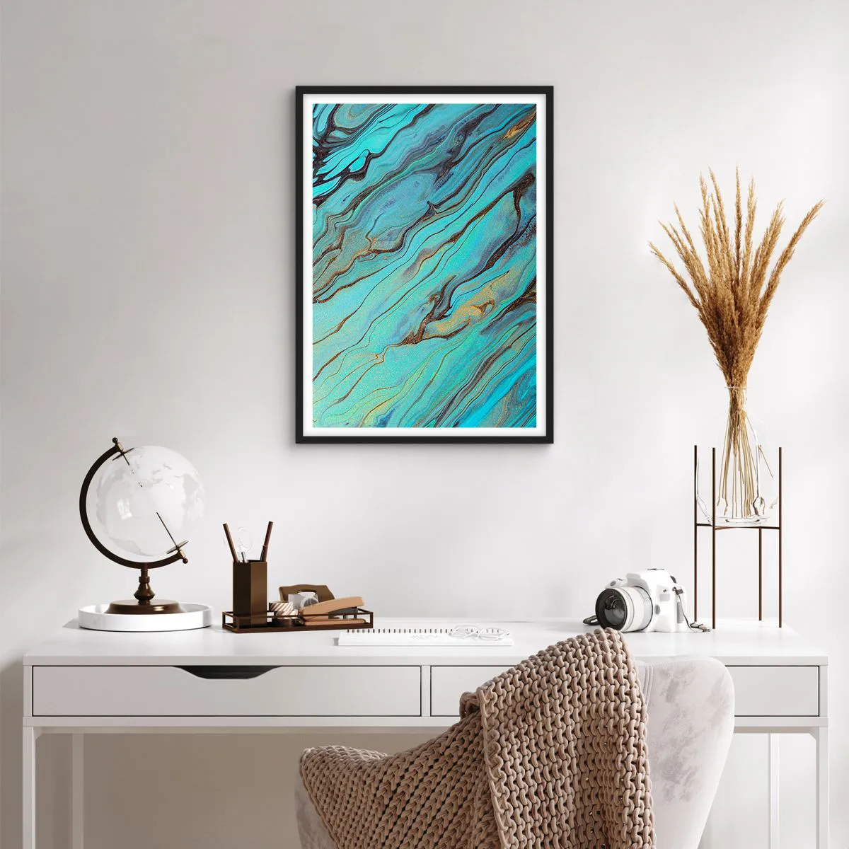 Der Marmoreffekt und die sanften Farbübergänge verleihen dem Poster ein äußerst elegantes und modernes Aussehen. Die kontrastreiche Kombination aus warmem Gold und kühlem Türkis verleiht der Komposition Tiefe und Raffinesse und macht es zu einer ausgezeichneten Wahl für stilvolle Innenräume.