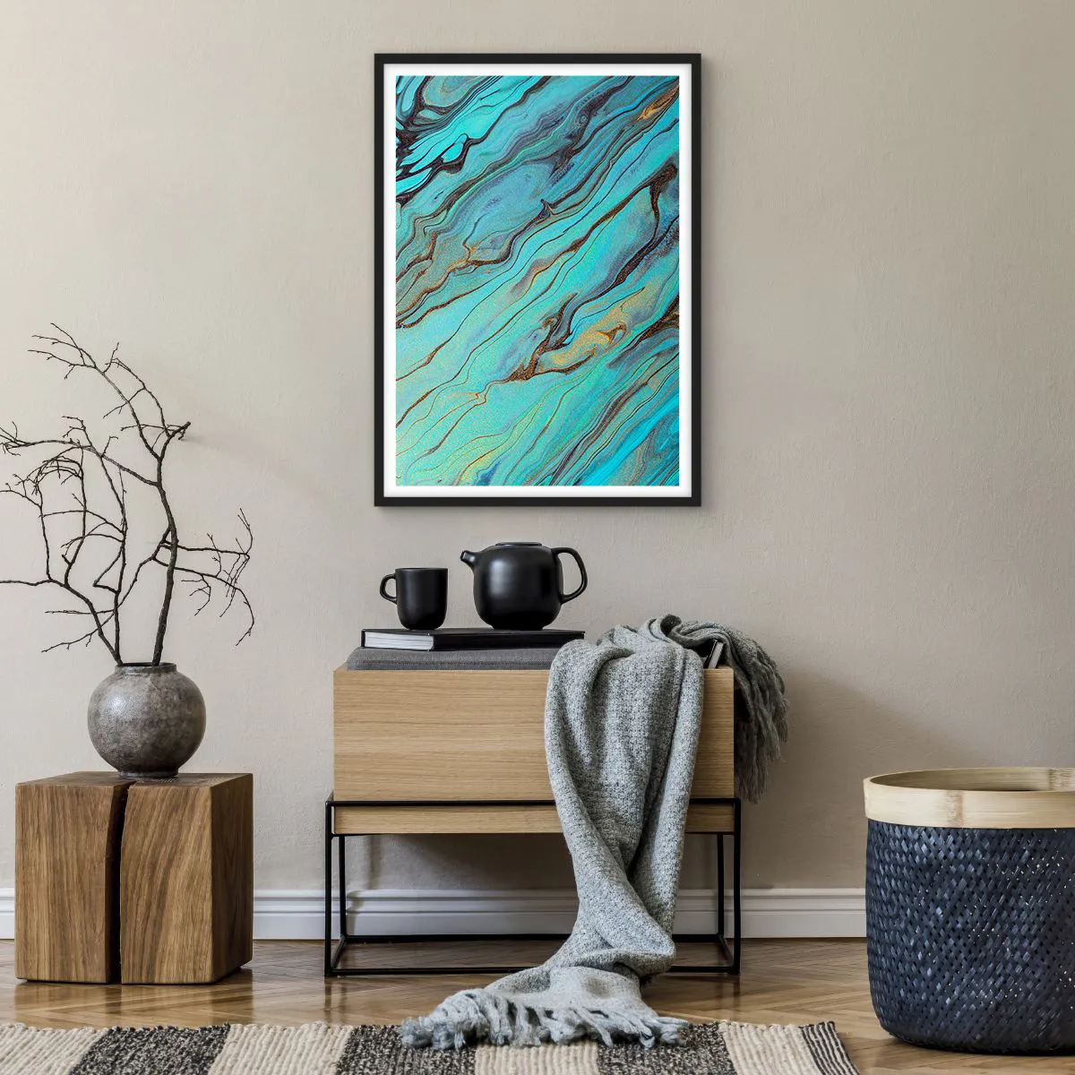 „Turquoise Tide“ ist die perfekte Wanddekoration für Liebhaber abstrakter Kunst und luxuriöser Arrangements. Das Poster bringt eine moderne Ästhetik ins Interieur und unterstreicht seinen einzigartigen und eleganten Charakter.