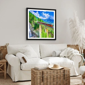 Poster in einem schwarzem Rahmen - Eine Achterbahn auf einer Brücke mit Blick auf einen Wasserfall und Berge - 70x50cm - Jetzt sind Alpen dran - Moderne Wanddekoration für Wohnzimmer und Schlafzimmer ARTTOR