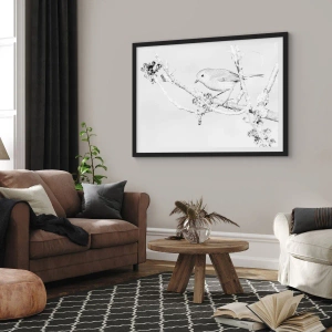 Poster in einem schwarzem Rahmen - Schwarz-weiße Zeichnung eines Vogels auf einem Ast - 50x70cm - Wintermorgen - Moderne Wanddekoration für Wohnzimmer und Schlafzimmer ARTTOR