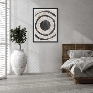 Poster in einem schwarzem Rahmen - Schwarze und weiße konzentrische Kreise auf hellem Hintergrund - 70x50cm - Auf den Punkt gebracht - Moderne Wanddekoration für Wohnzimmer und Schlafzimmer ARTTOR