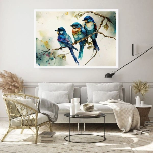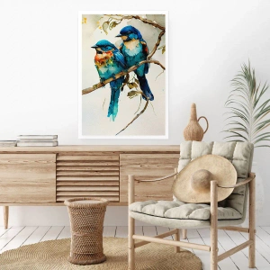 Poster - Aquarellvögel auf einem Ast in Blau- und Brauntönen - 50x70cm - War er beleidigt? - Moderne Wanddekoration für Wohnzimmer und Schlafzimmer ARTTOR